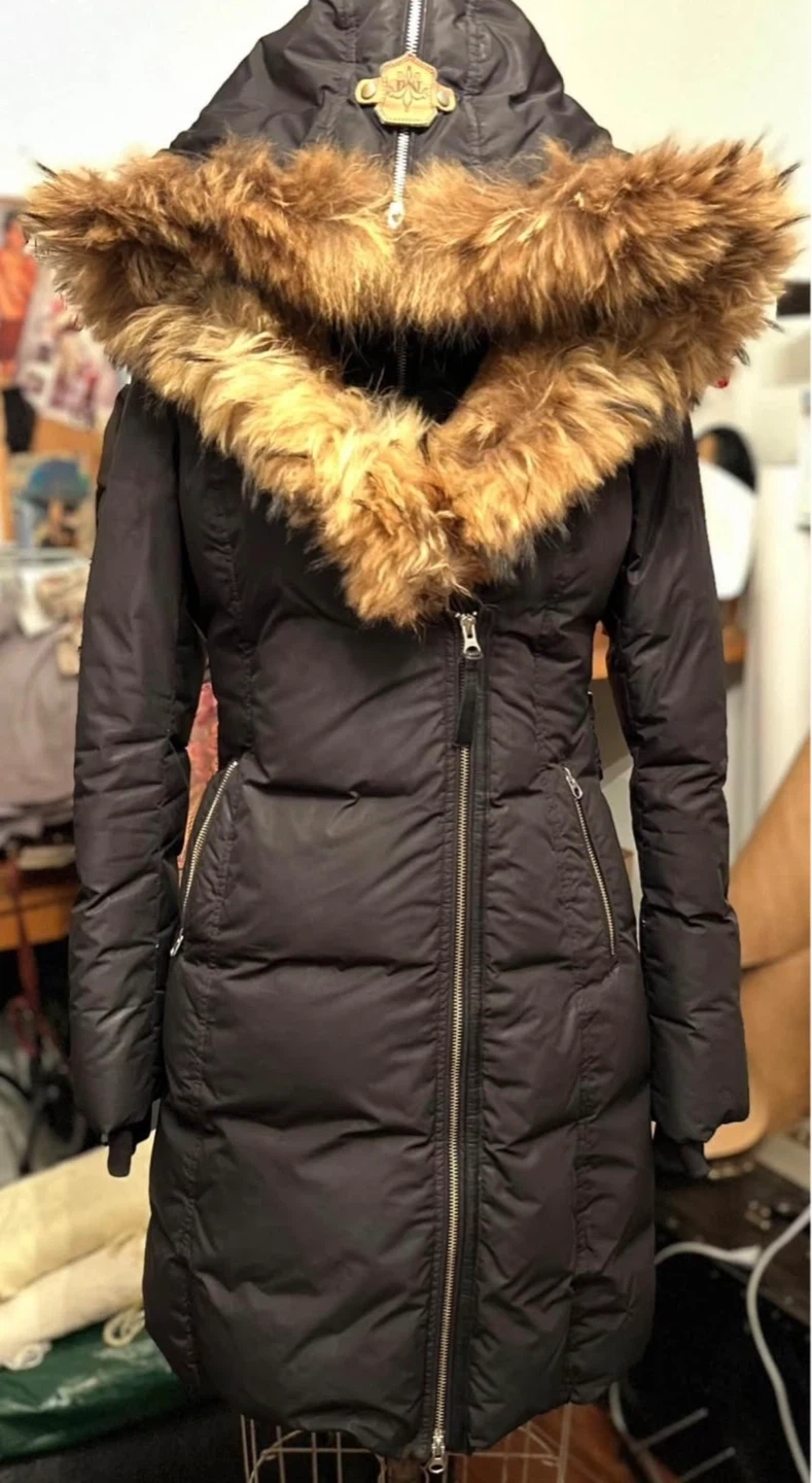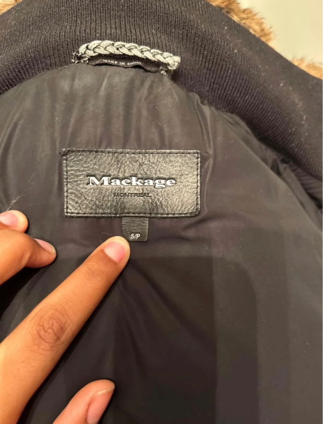 This Mackage parka is black and features a fur-trimmed hood. It's a size S/P , no damage & dry cleaned