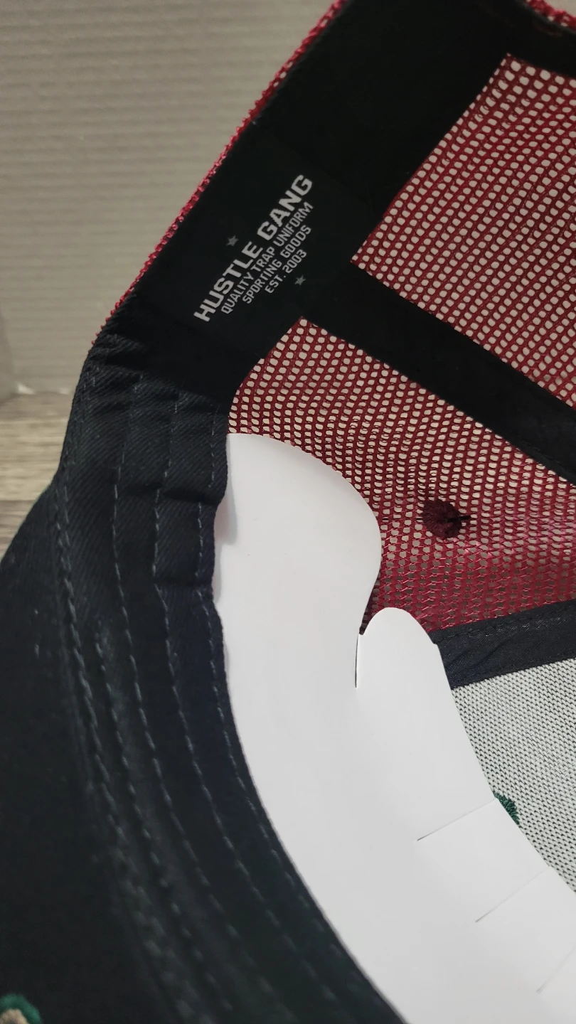 Hustle Gang trucker hat with embroidered front logo and "God Bless These Streets" on the back. Features a mesh back for breathability. One size fits most.
