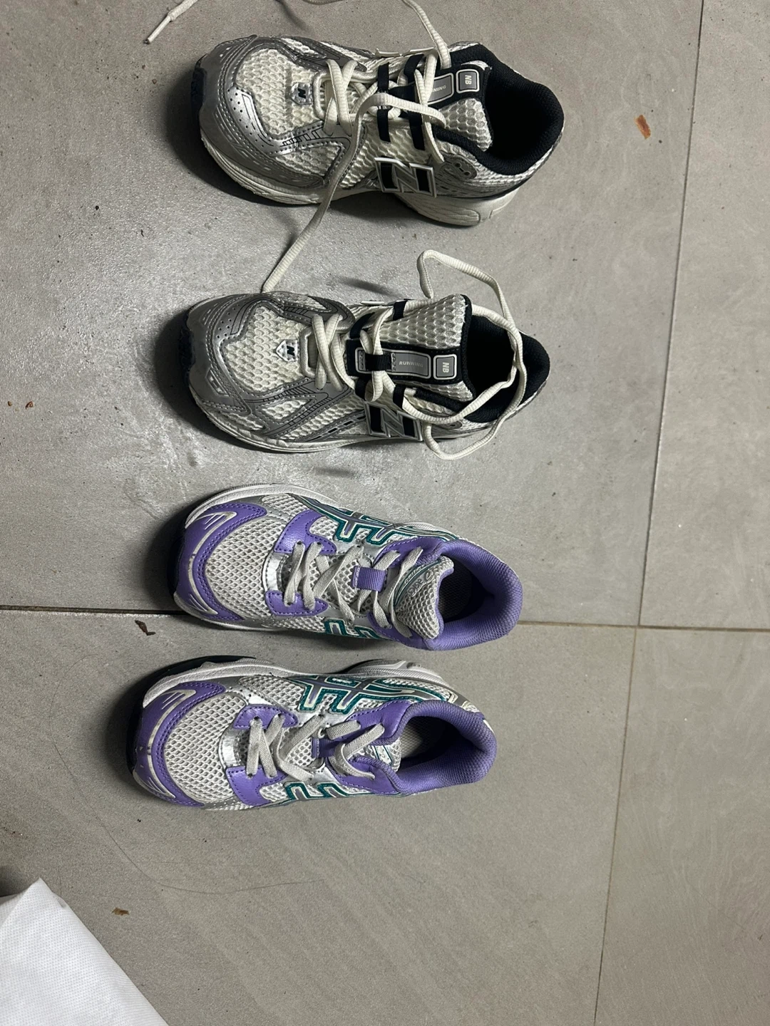 Selling two pairs of Asics kids sneakers. One pair is silver and black, and the other is white and purple. They are in used condition.
