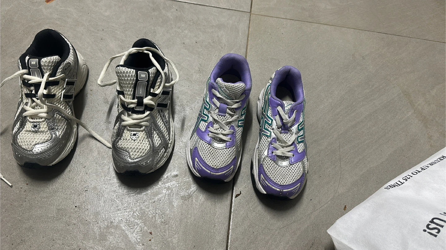 Selling two pairs of Asics kids sneakers. One pair is silver and black, and the other is white and purple. They are in used condition.