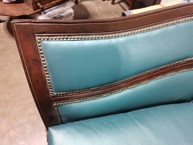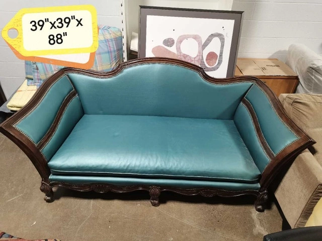 Add a touch of elegance to your living space with this eye-catching couch, featuring an ornate dark wood frame and teal fabric upholstery. This couch has a unique character. Louis Philippe sofa in mahogany wood nineteenth century the piece is super wide so require a house with double entrance door to move in. Approximate Dimensions: - Length: 88" - Width: 39" - Height: 39" Transform your home with this stunning couch! By the way, if the ad is up, it's still available!