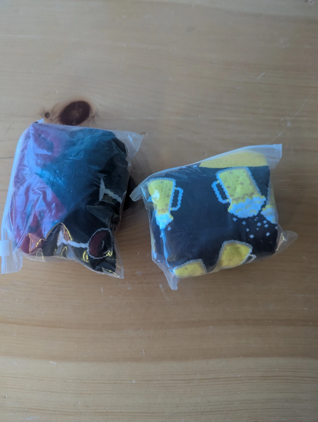 Two pairs of new, individually packaged novelty socks. One pair features a beer mug design, and the other has a red and black argyle pattern. These socks are a fun addition to any casual outfit!