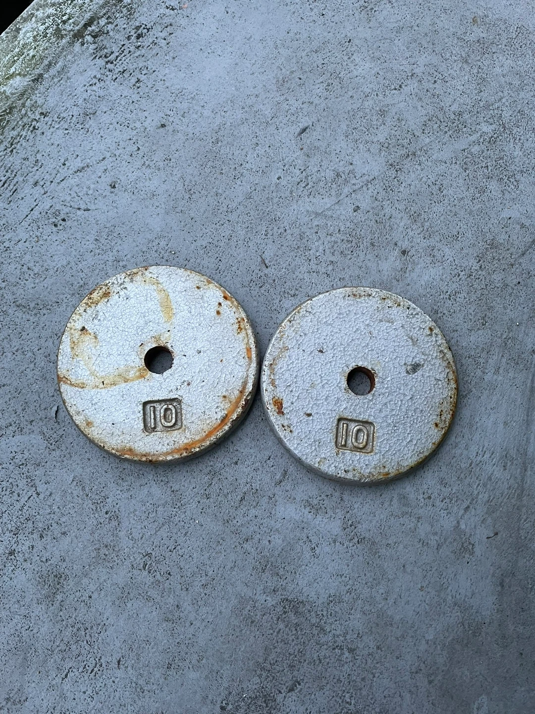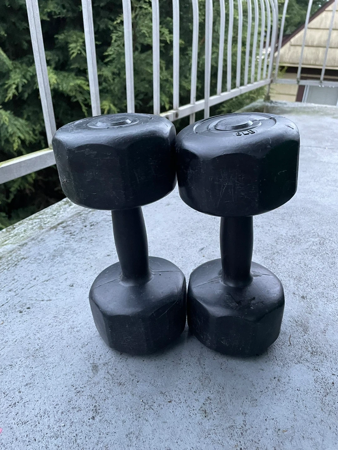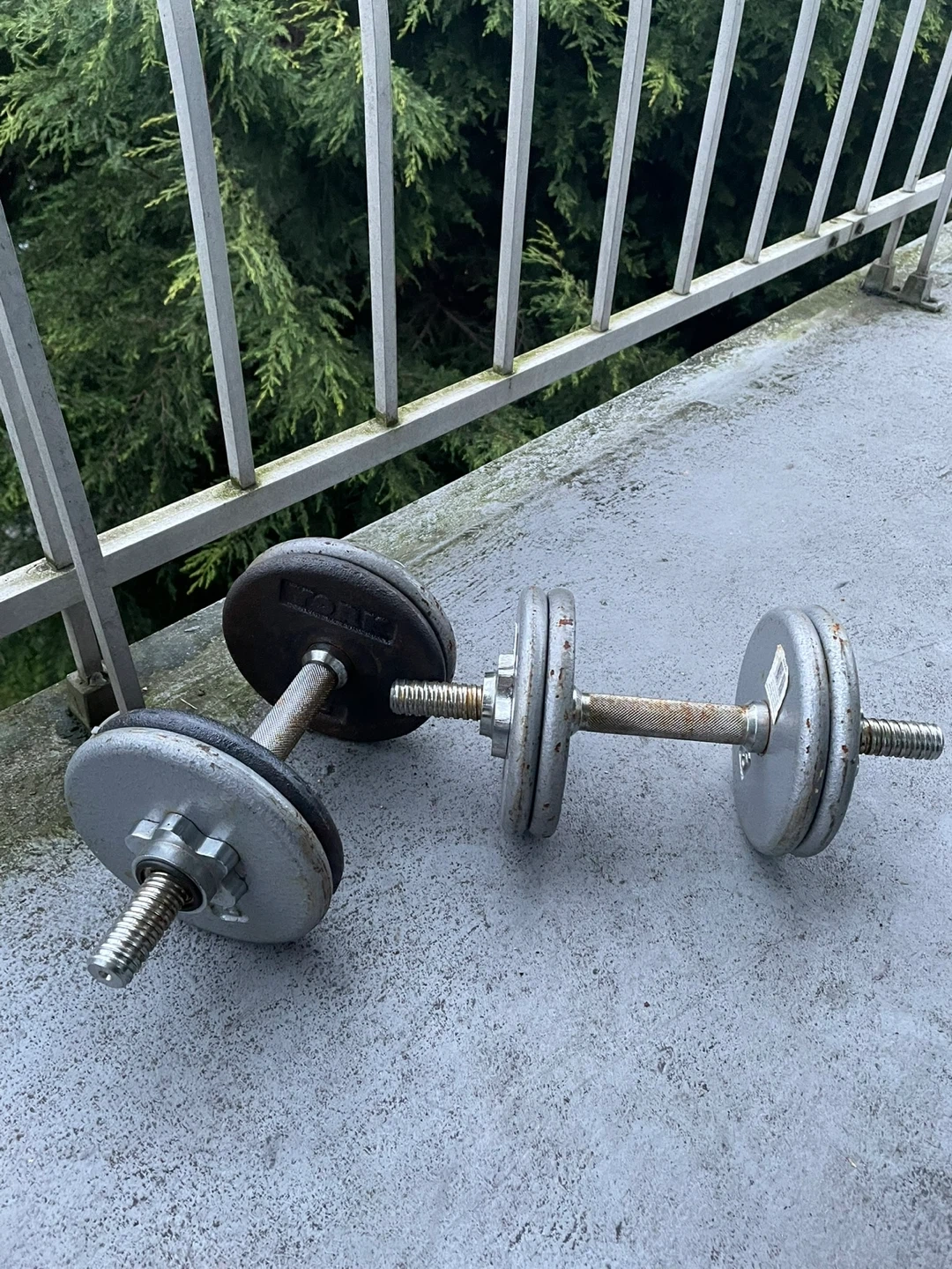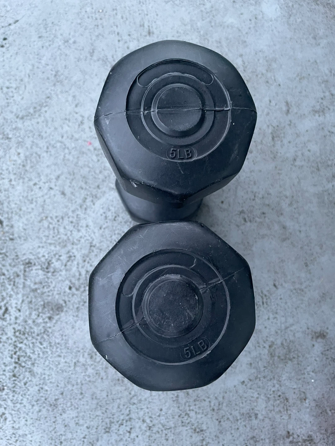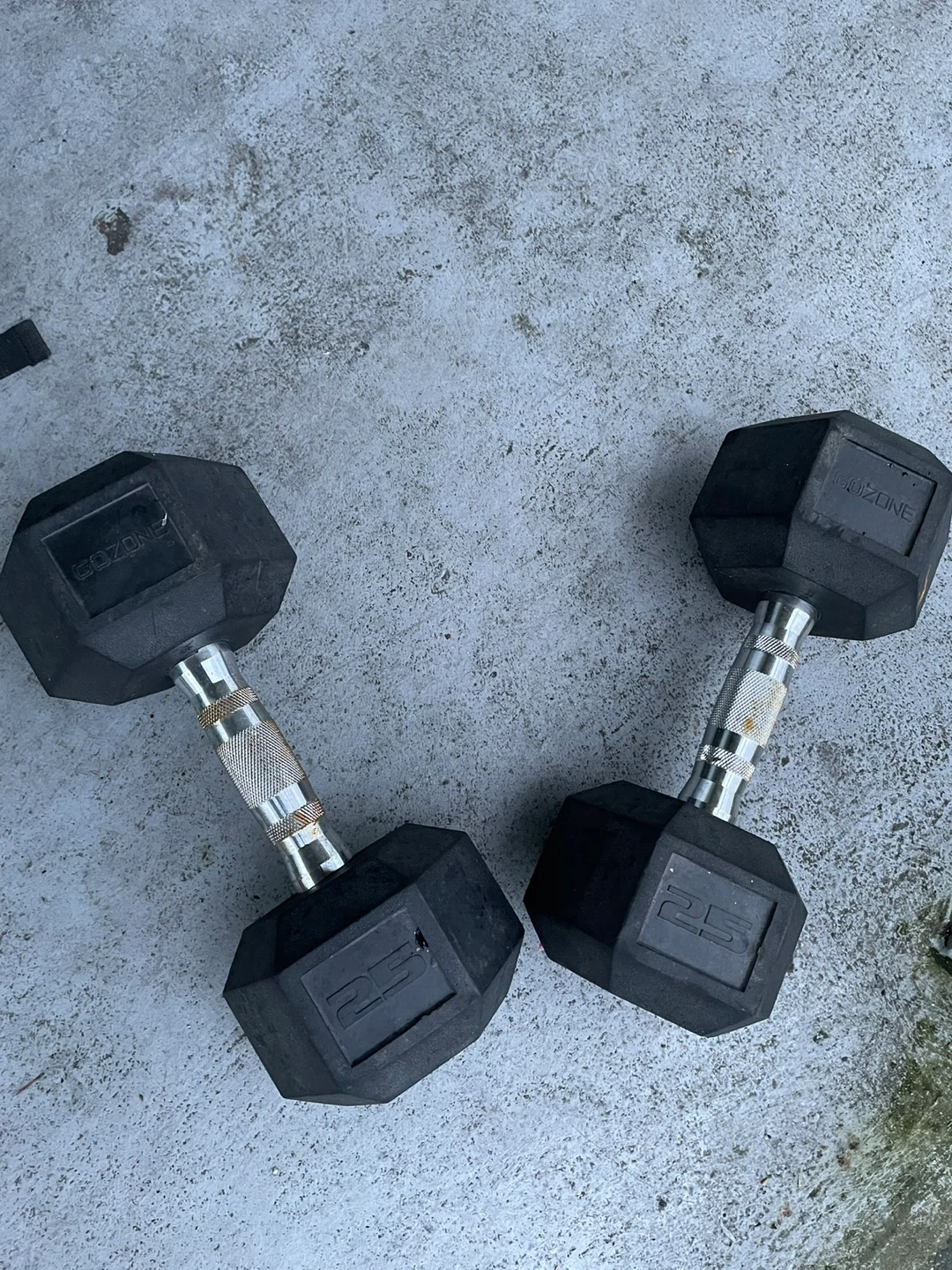Includes two 5lb hex dumbbells, two 25lb hex dumbbells, a set of adjustable dumbbells (approx. 10-20lb each), and a barbell with weight plates. Ready for your home gym setup!