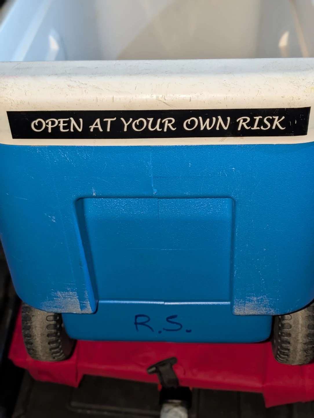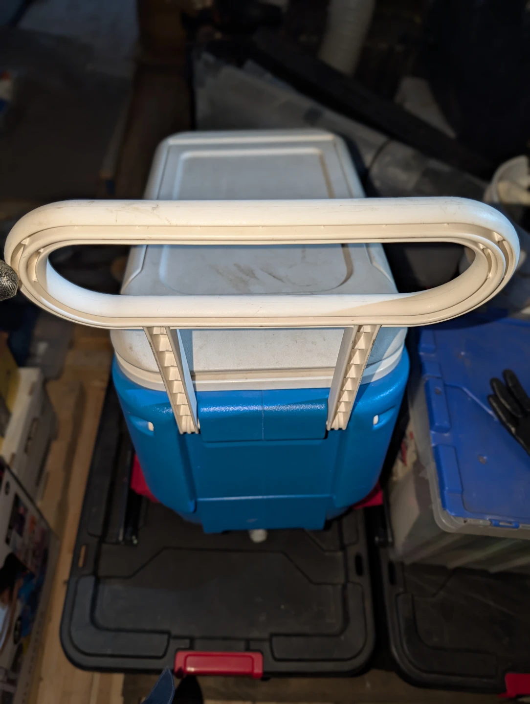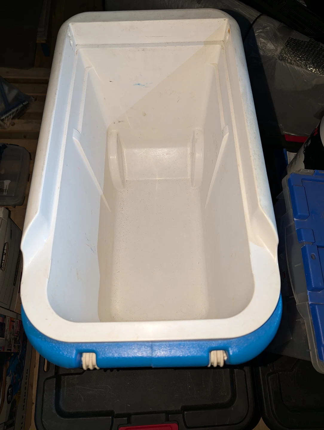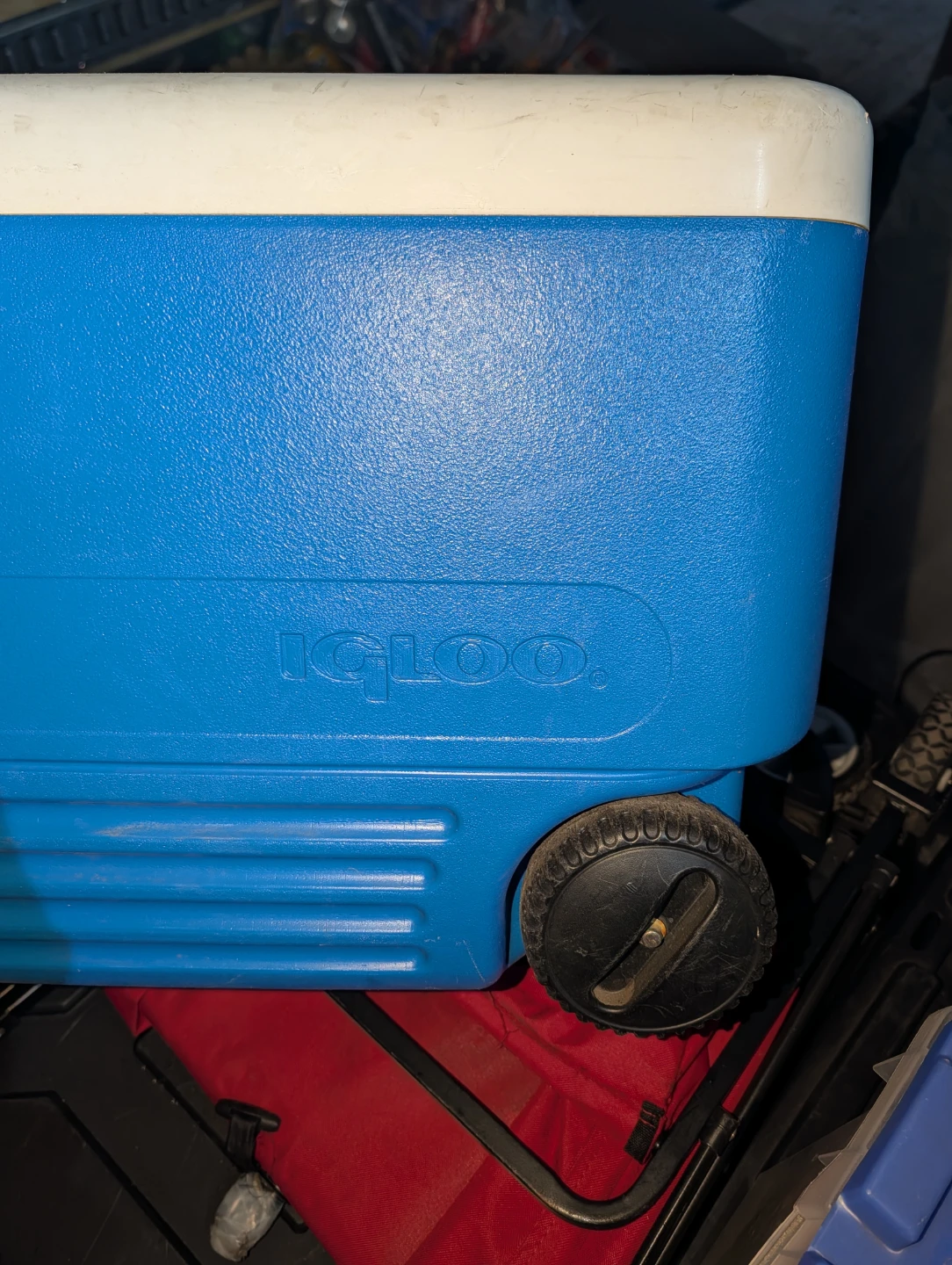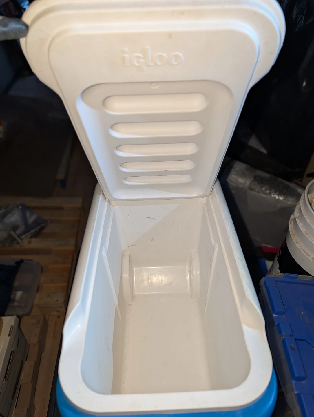 Igloo cooler with wheels and a retractable handle. Blue and white color. Perfect for picnics and outdoor events! Looking for a new home