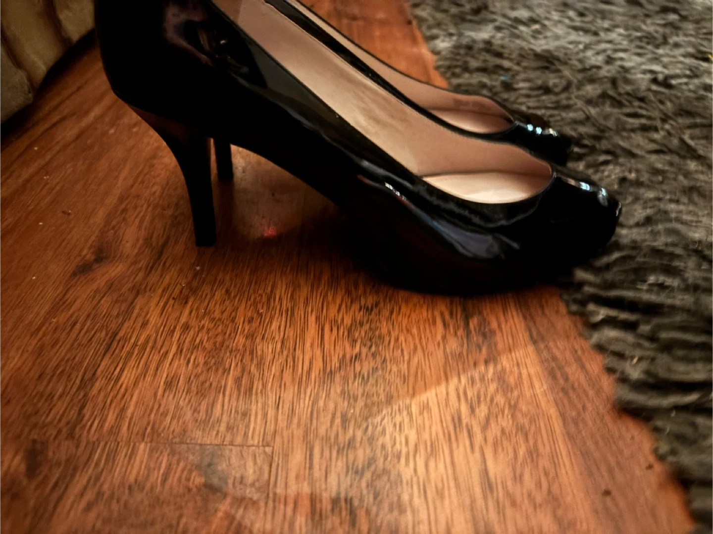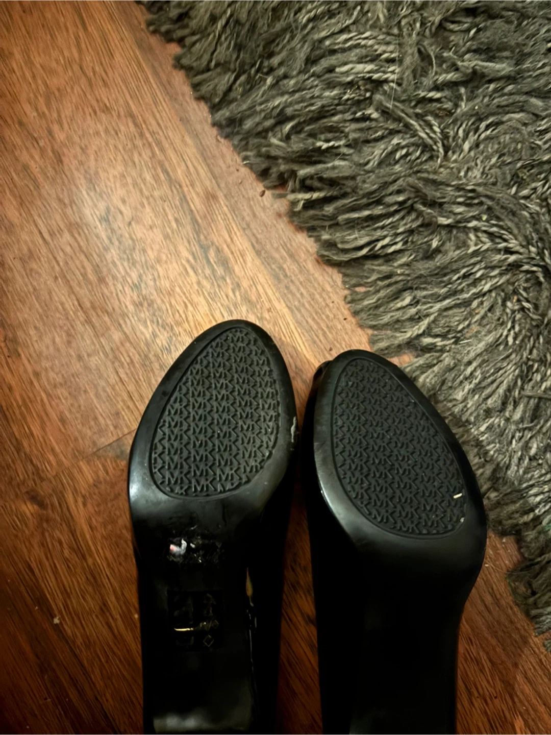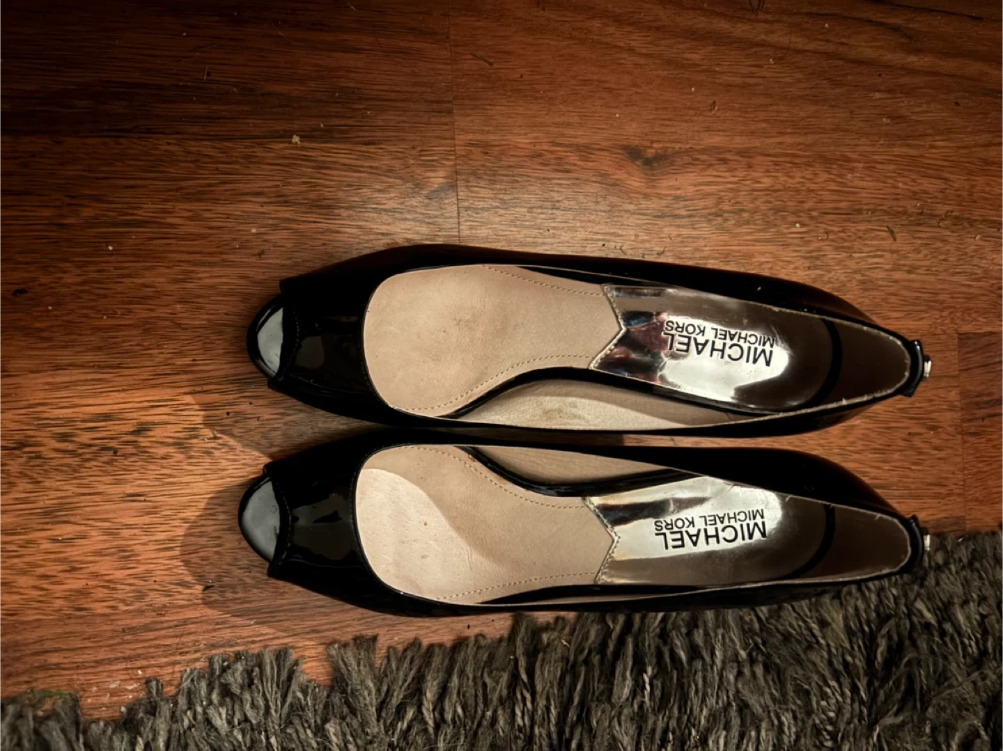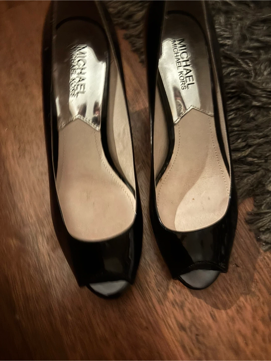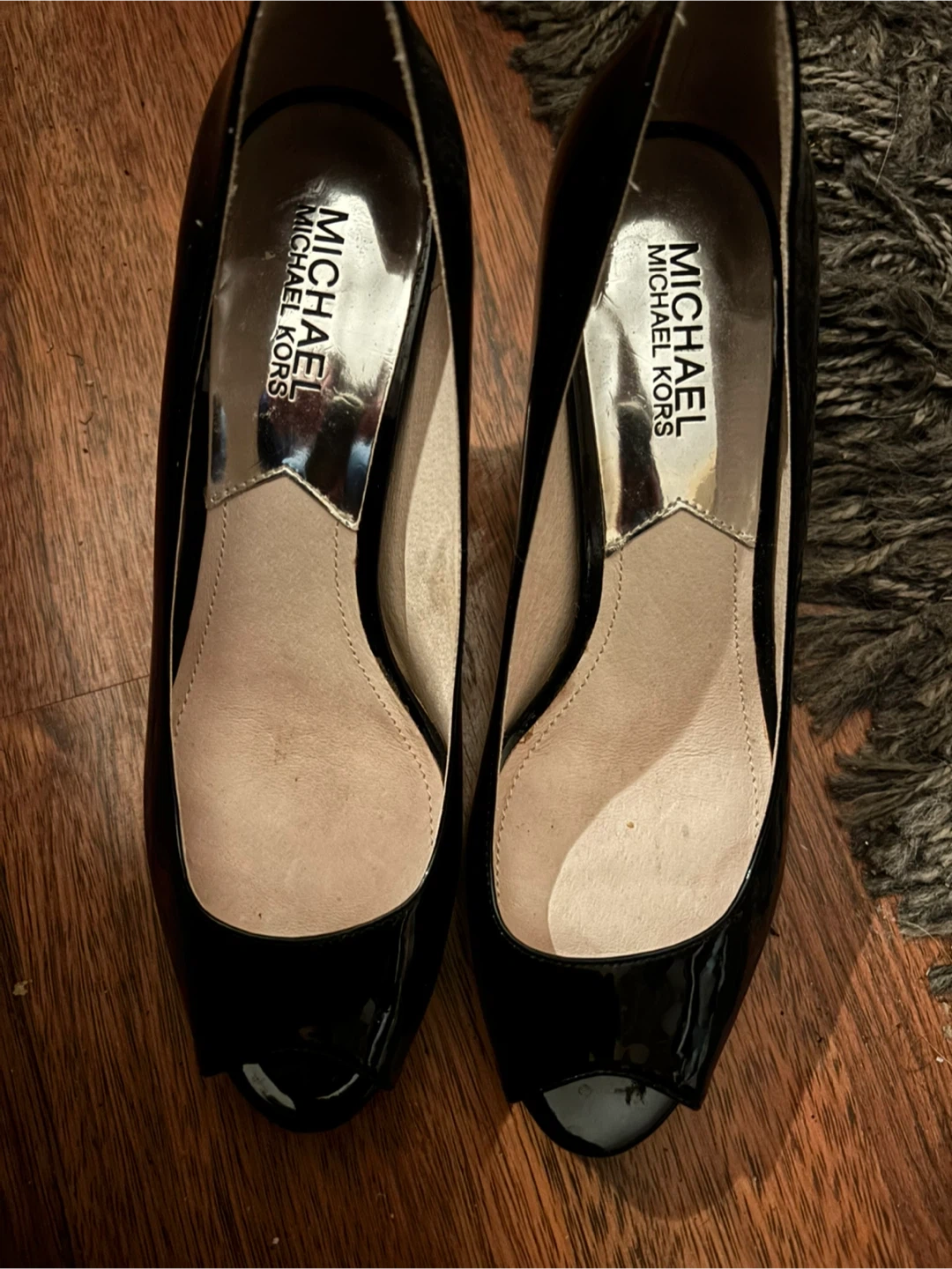 Classic Michael Kors peep-toe heels in a glossy black patent finish. They are size 7 but fit small, more like a 6.5. These stylish heels are perfect for dressing up any outfit, whether for work or a night out. Leather lining. Worn once.