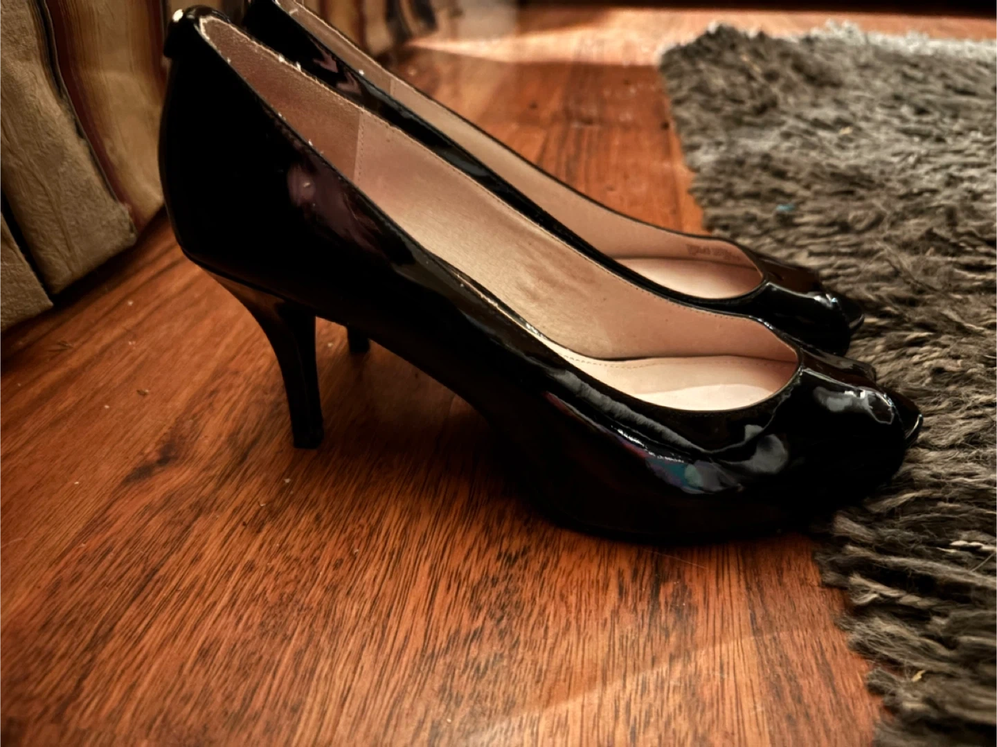 Classic Michael Kors peep-toe heels in a glossy black patent finish. They are size 7 but fit small, more like a 6.5. These stylish heels are perfect for dressing up any outfit, whether for work or a night out. Leather lining. Worn once.