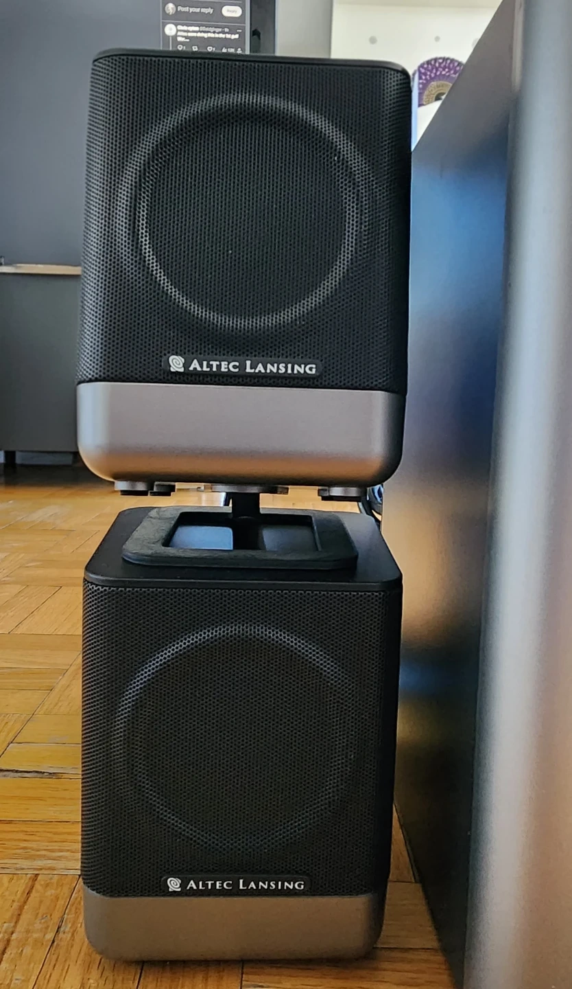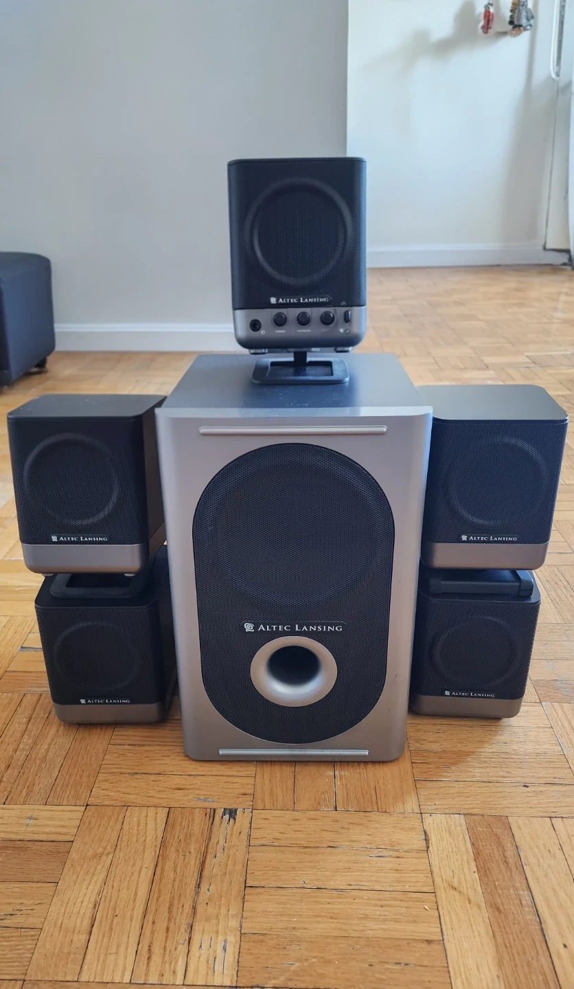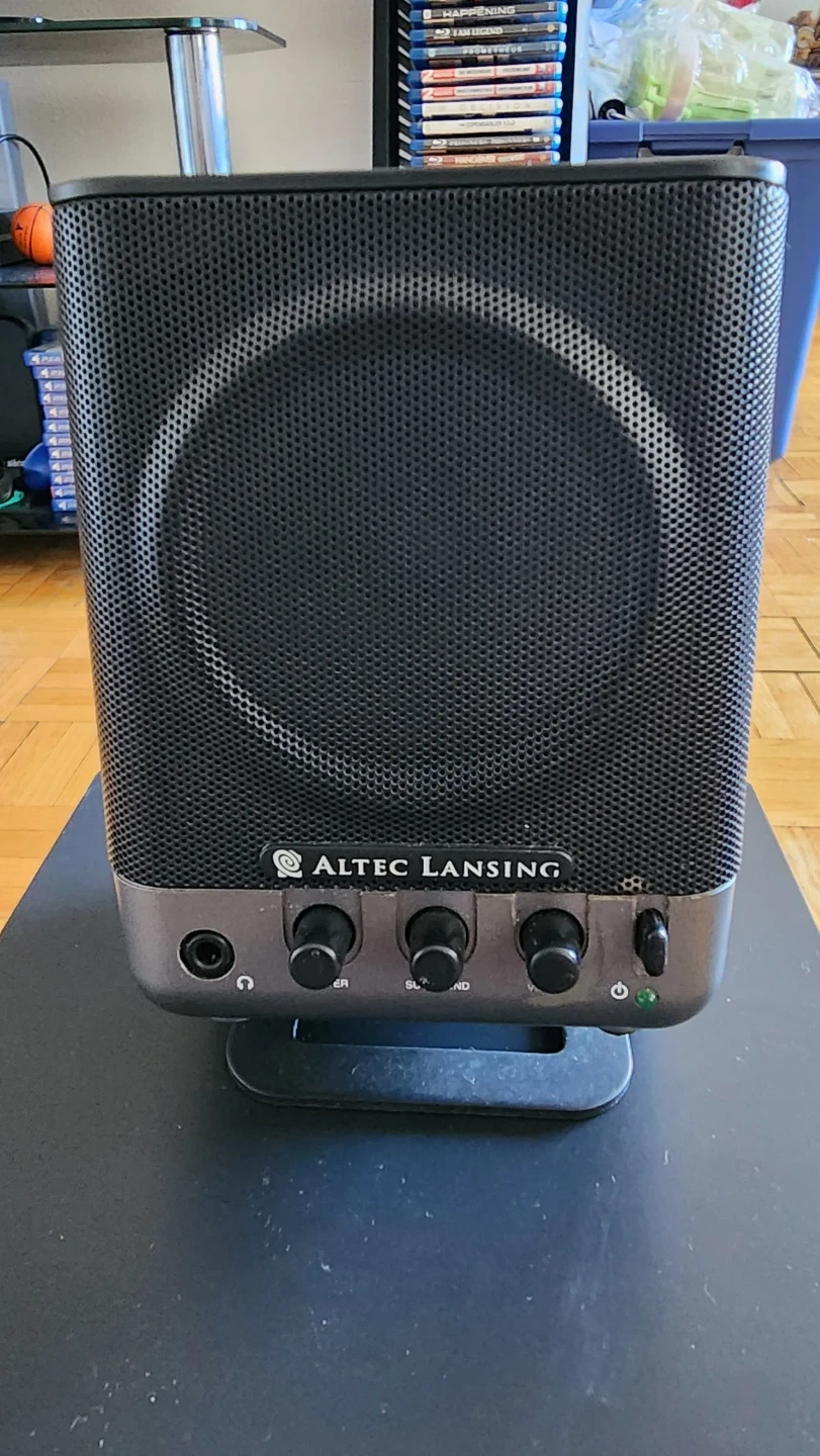 This Altec Lansing speaker system includes a subwoofer and satellite speakers. It's designed for immersive audio. Great for a desktop setup or small room!