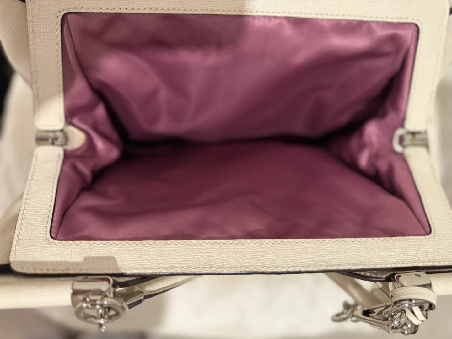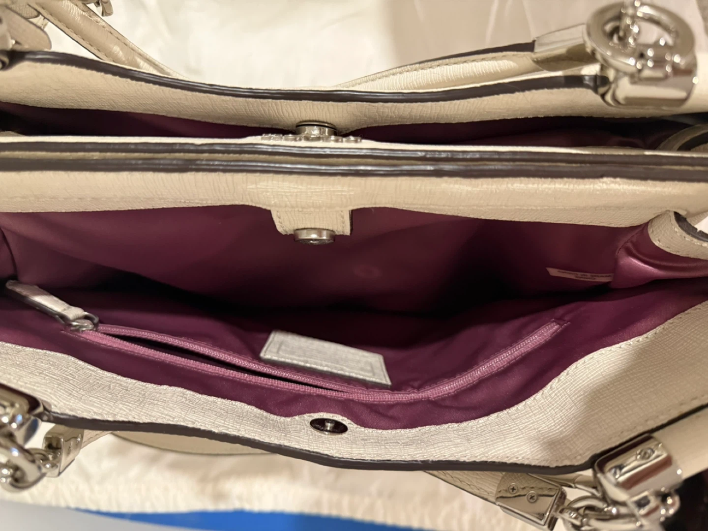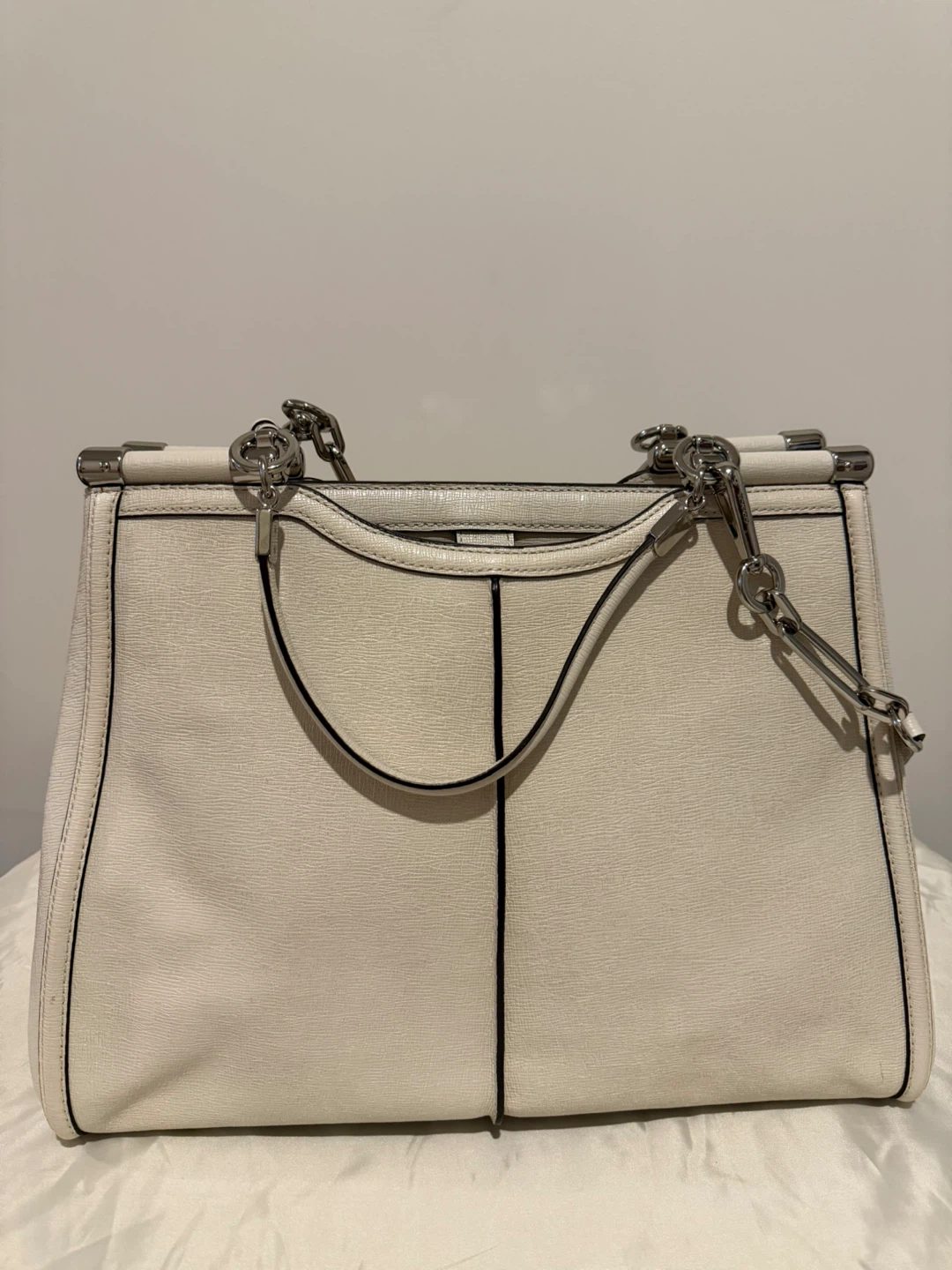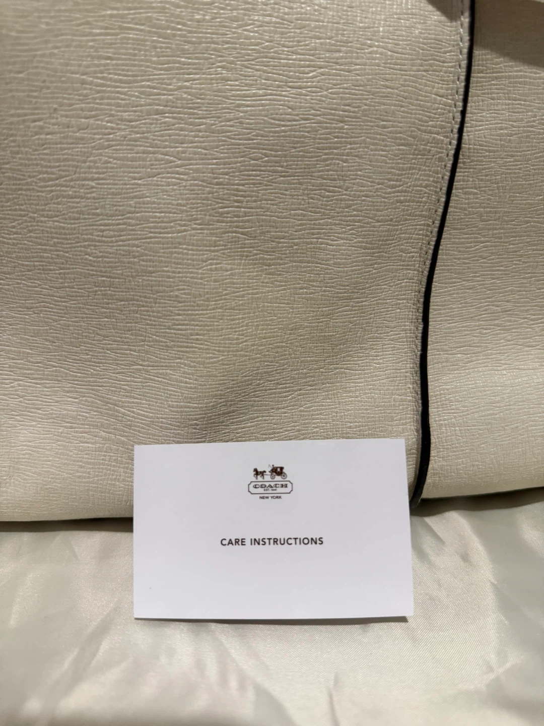 Selling a lovely Coach handbag in ivory leather. It's in great condition and comes with its original dust bag! The bag features silver-tone hardware and a structured design, perfect for everyday use or special occasions. Feel free to reach out if you have any questions!