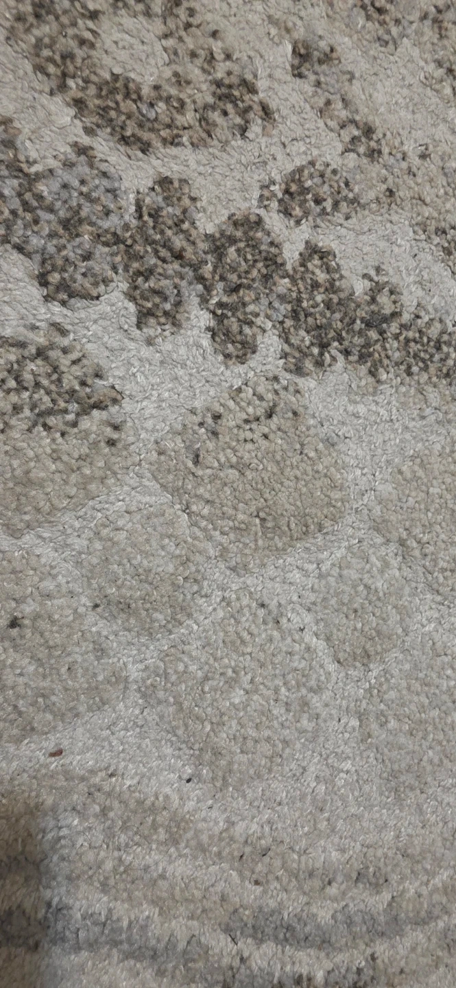 Very clean light-coloured area rug with a textured pattern. It's approximately 5' x 8' in size. This rug adds a modern touch to any room.