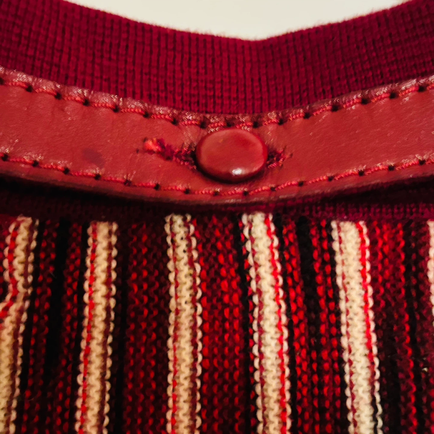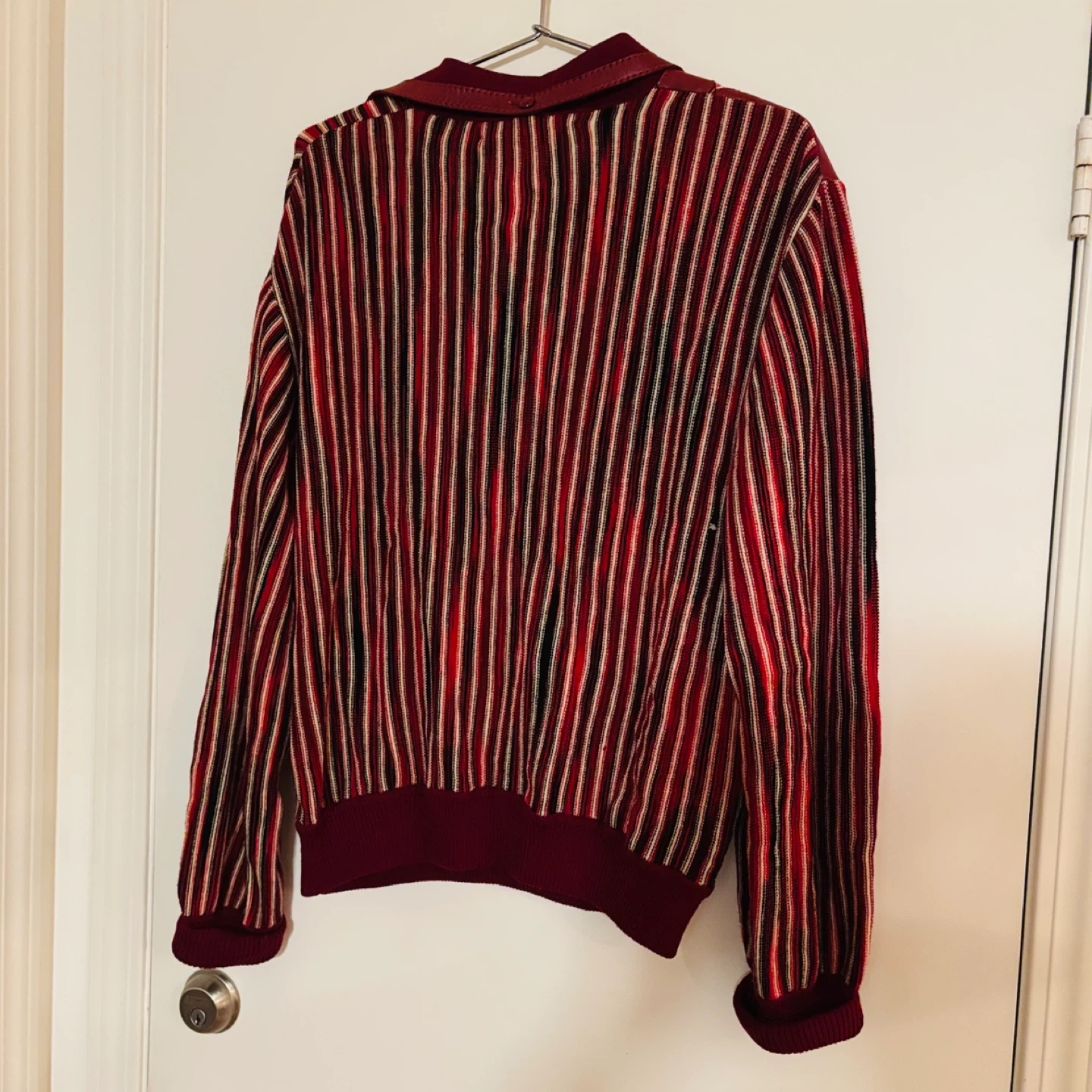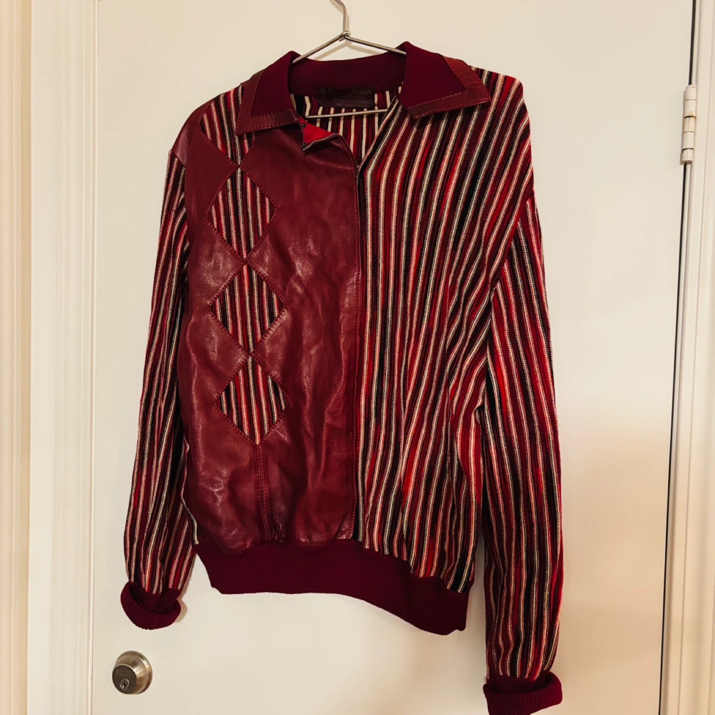Extremely rare!!! These sell for 300-500. Made in Italy! It features genuine leather and a unique striped design in red, white, and black wool. The jacket is in great condition, with some wear in the cuffs that is unnoticeable when rolled and an easy repair.