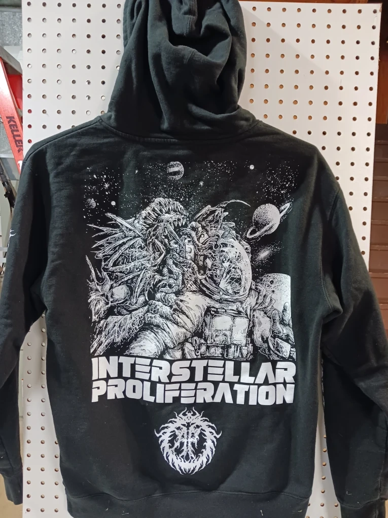 Selling a black hoodie with a unique Interstellar Proliferation design! The hoodie features graphics on the sleeves and back, adding a cool touch to the overall look