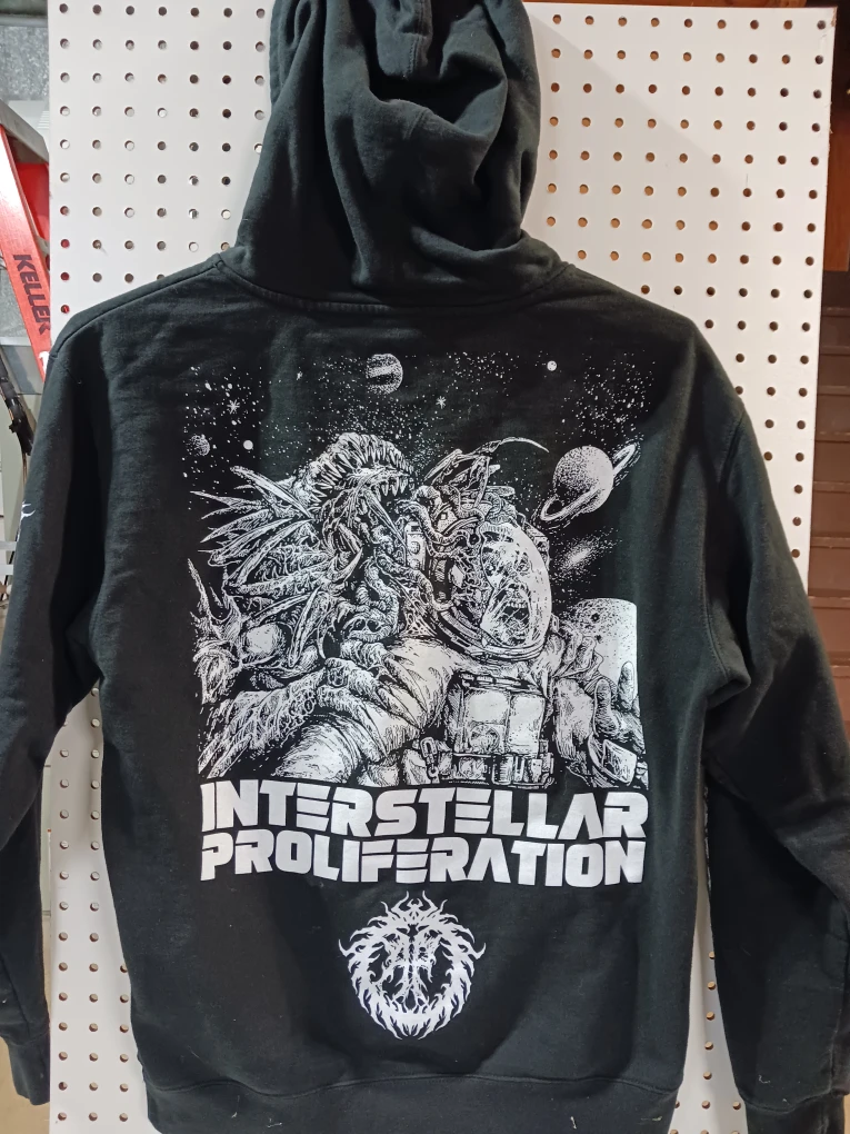 Selling a black hoodie with a unique Interstellar Proliferation design! The hoodie features graphics on the sleeves and back, adding a cool touch to the overall look
