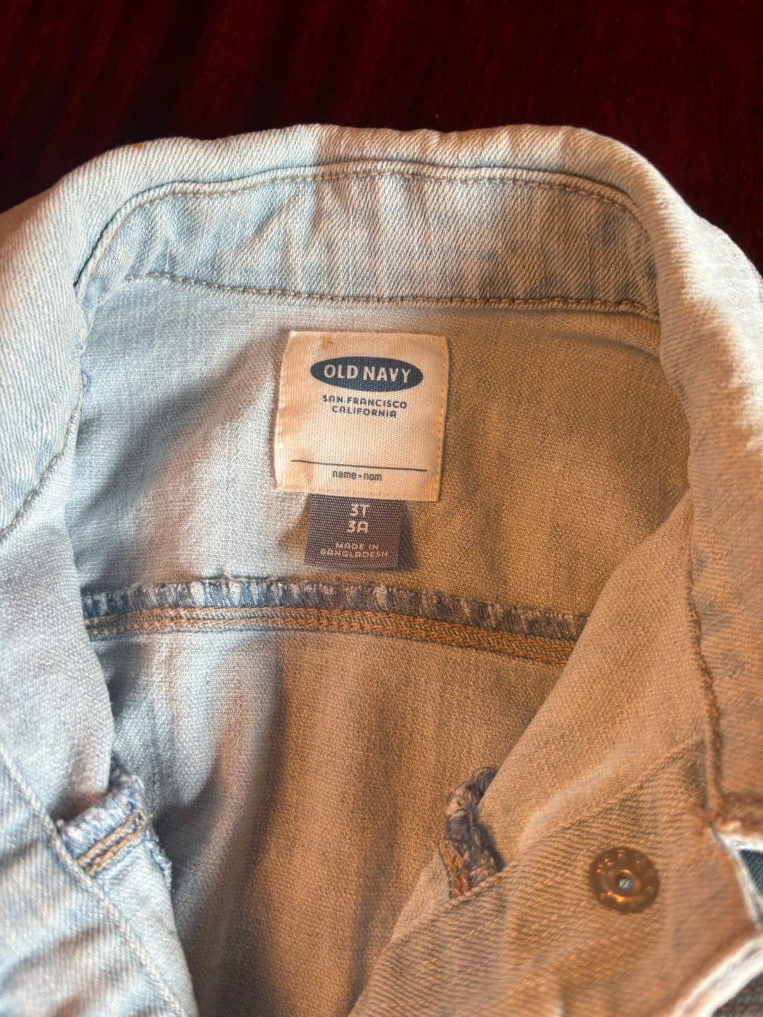 Old Navy light wash denim jacket for toddlers. It's a size 3T and made in Bangladesh. This classic jacket is great for layering over any outfit!