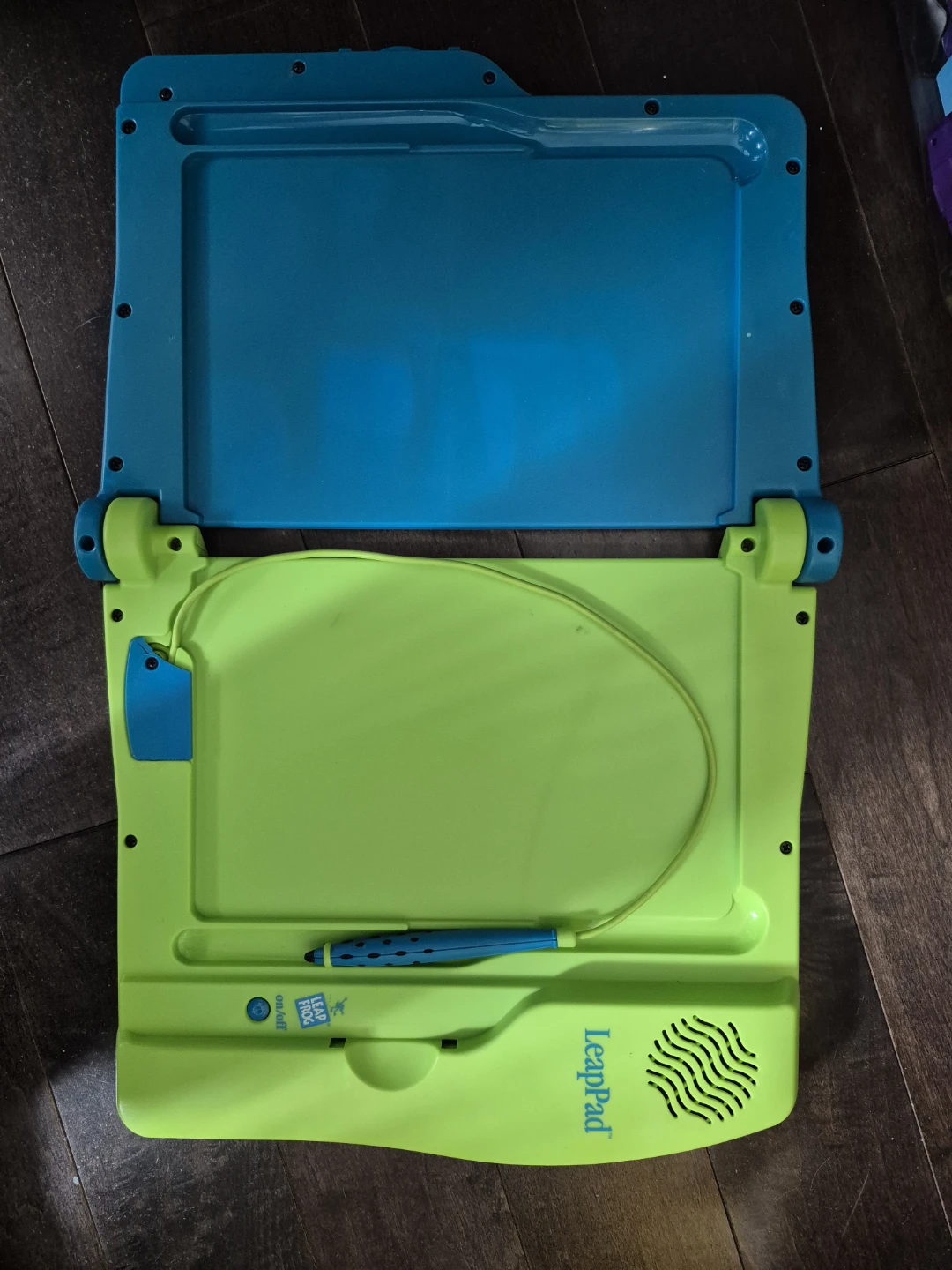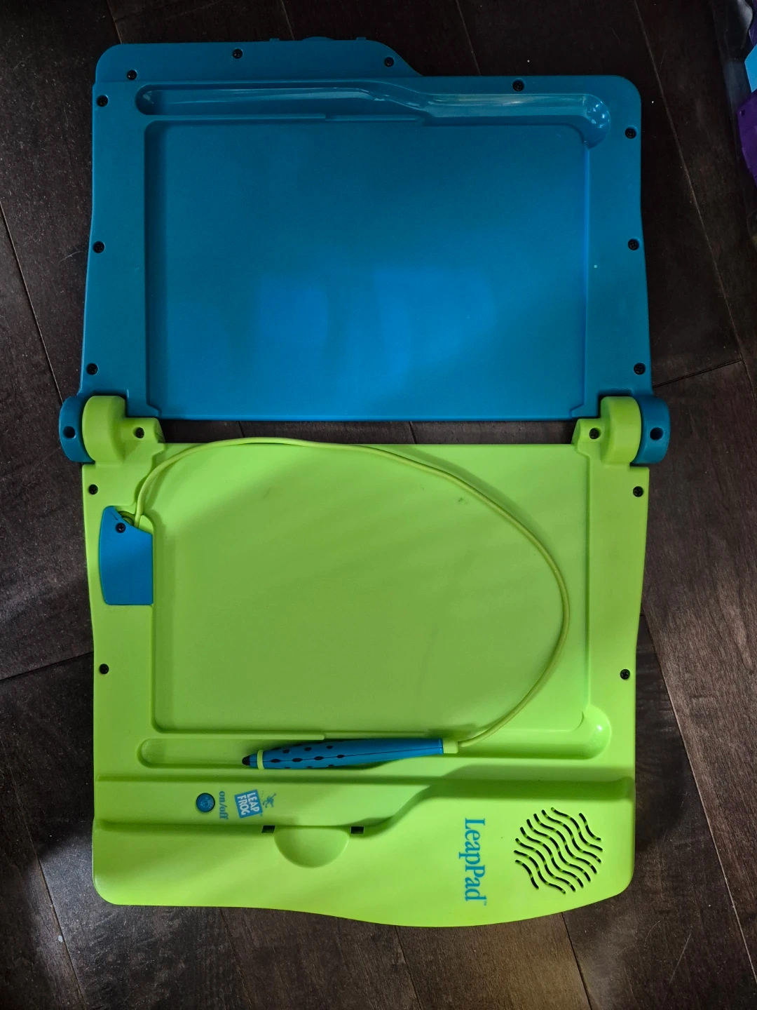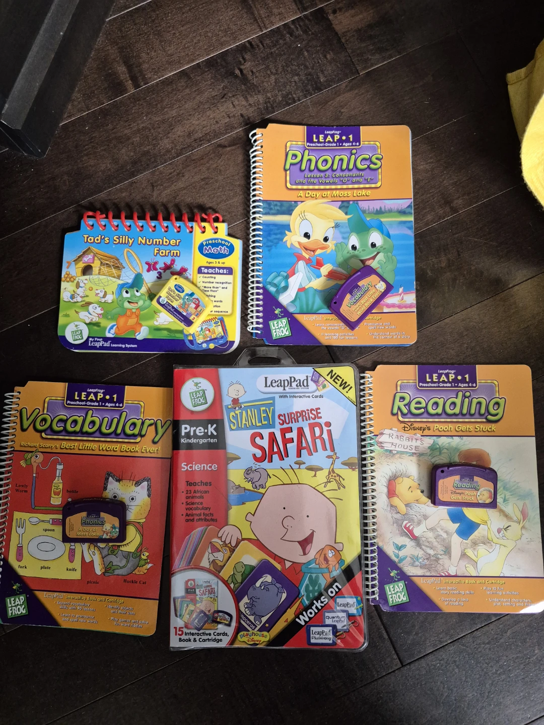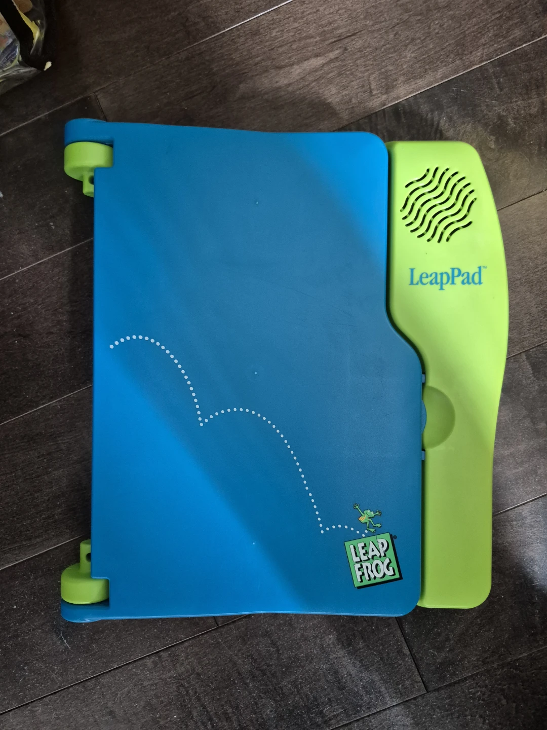 This is a LeapFrog LeapPad learning system in blue and green. It includes interactive learning books and cartridges for phonics, vocabulary, reading, and math. The system is designed for ages 4-6. It's a great way to make learning fun for young kids!