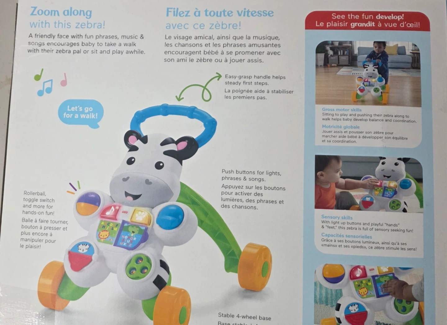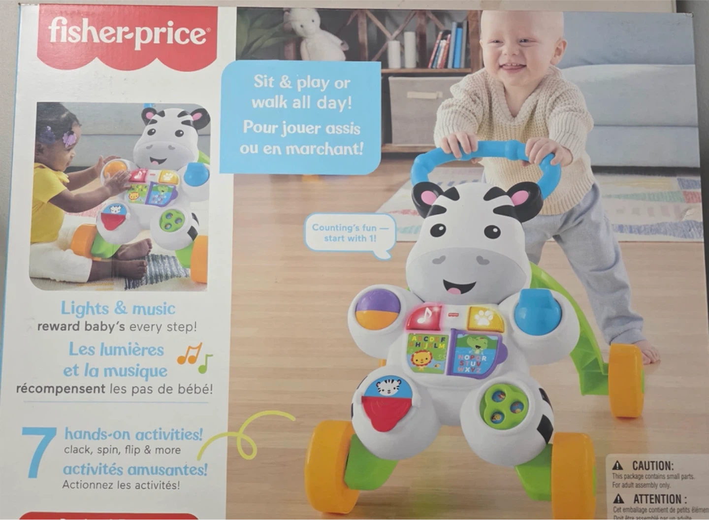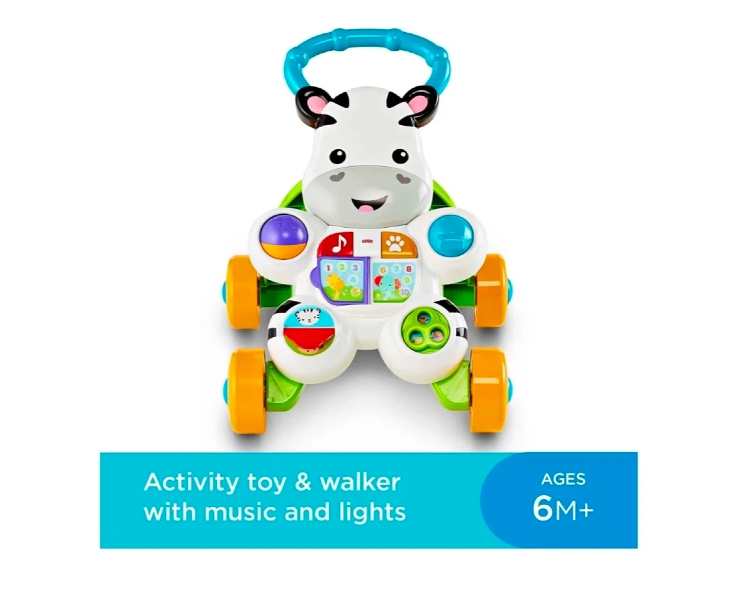 Fisher-Price zebra walker with music and lights. It's an activity toy and walker with songs and phrases that teach the alphabet and numbers. Recommended for ages 6 months and up!