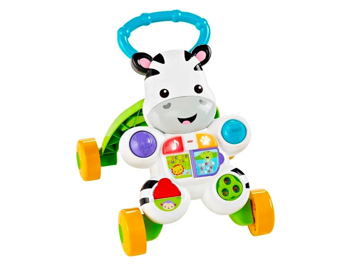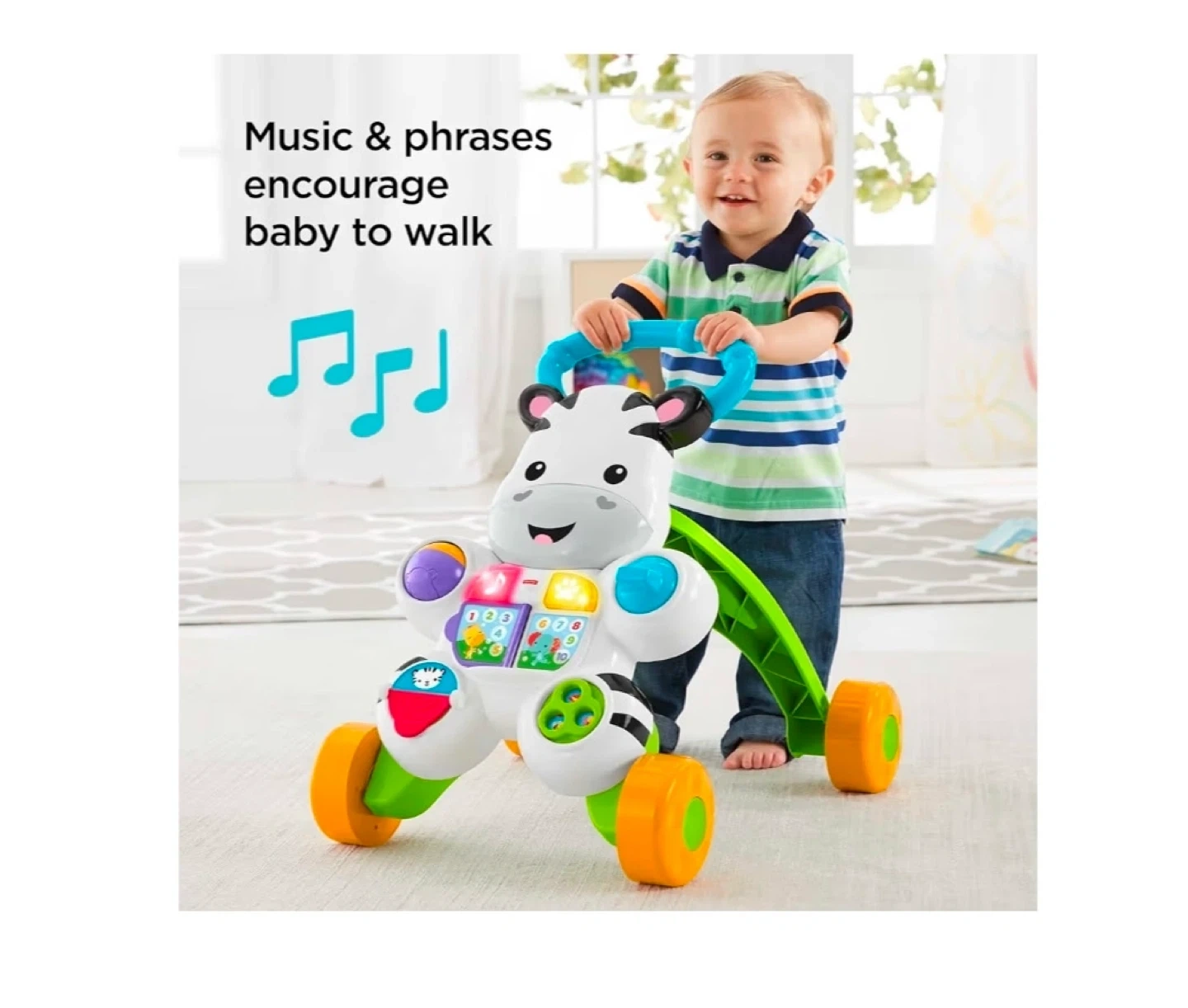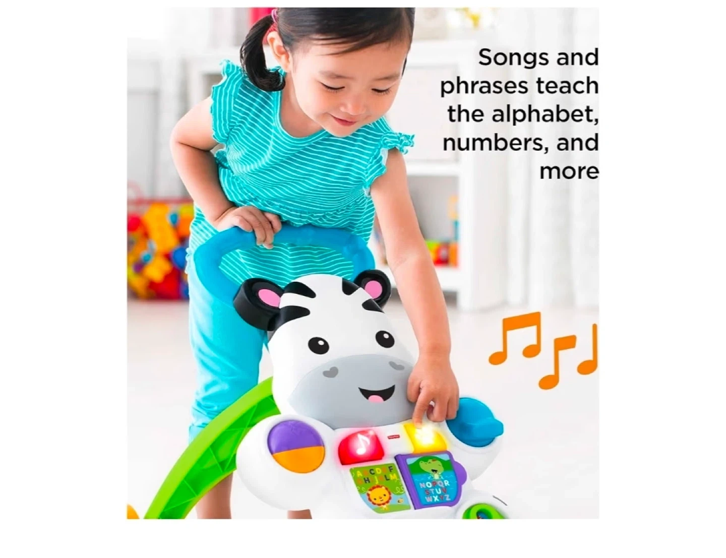 Fisher-Price zebra walker with music and lights. It's an activity toy and walker with songs and phrases that teach the alphabet and numbers. Recommended for ages 6 months and up!
