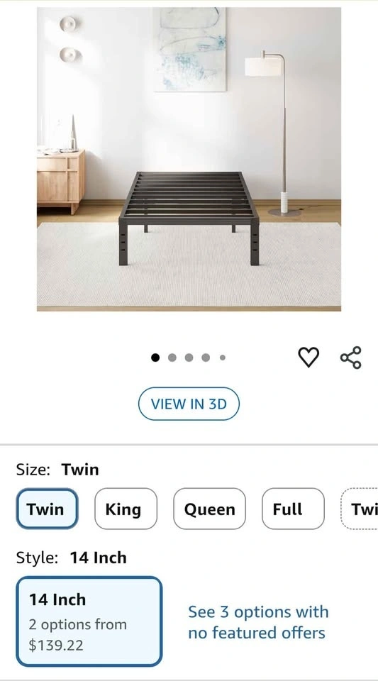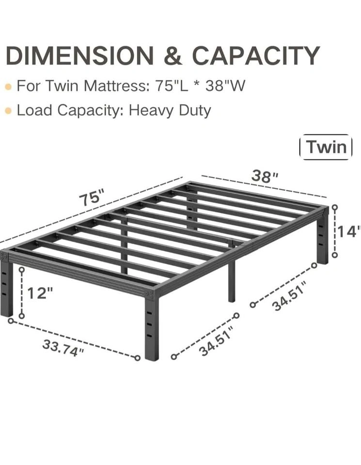Sturdy twin bed frame. Metal frame, 14 inch height. Super easy assembly, has integrated structure and easy lock slats. Holds up to 3000 lbs. Inward leg design for improved stability. Great for a guest room or kids room. Headboard compatible. In original box. Original price $160 including tax.
