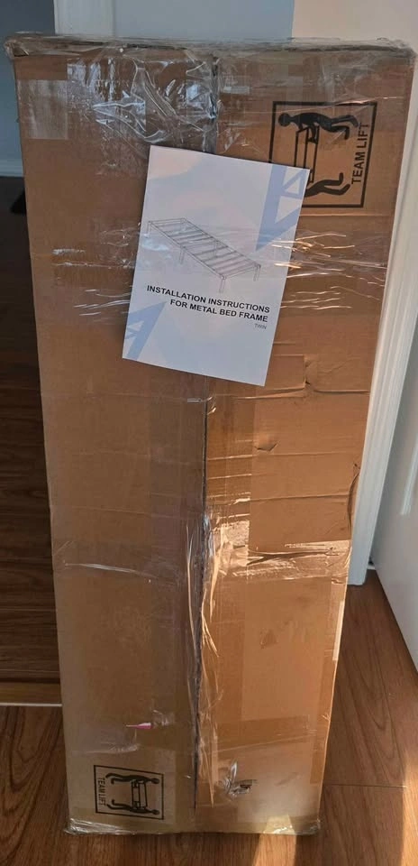 Sturdy twin bed frame. Metal frame, 14 inch height. Super easy assembly, has integrated structure and easy lock slats. Holds up to 3000 lbs. Inward leg design for improved stability. Great for a guest room or kids room. Headboard compatible. In original box. Original price $160 including tax.