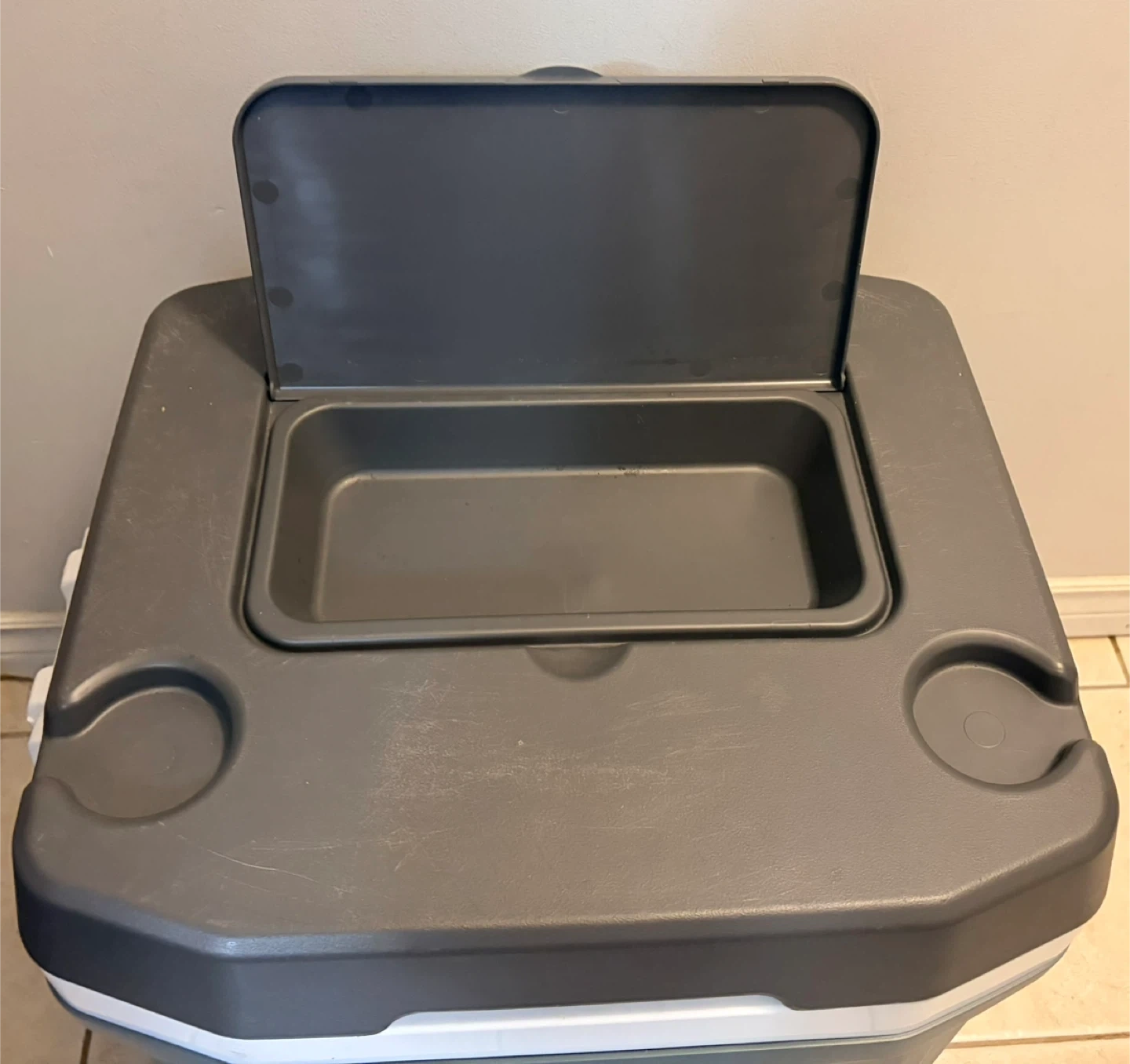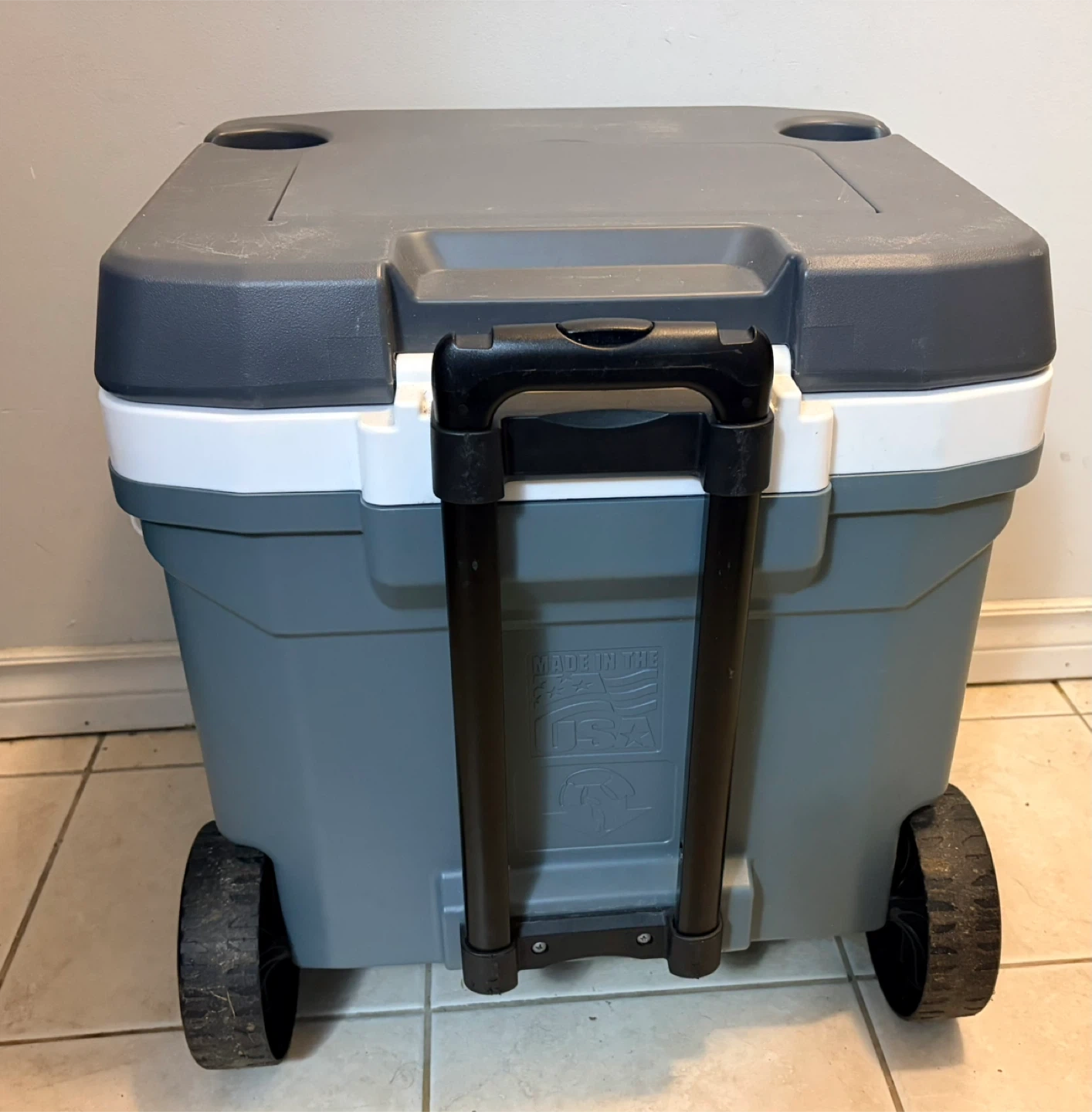 Selling an Igloo Latitude 62 Roller cooler. It has some signs of use. It features a telescoping handle and durable wheels for easy transport. Great for picnics, camping, or any outdoor event! It has a minor damage (i have added a picture), doesn’t affect functionality.