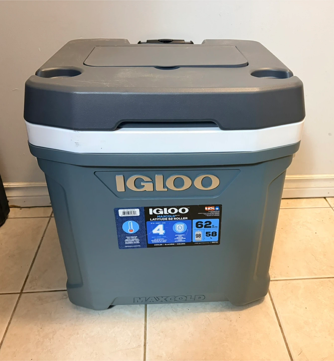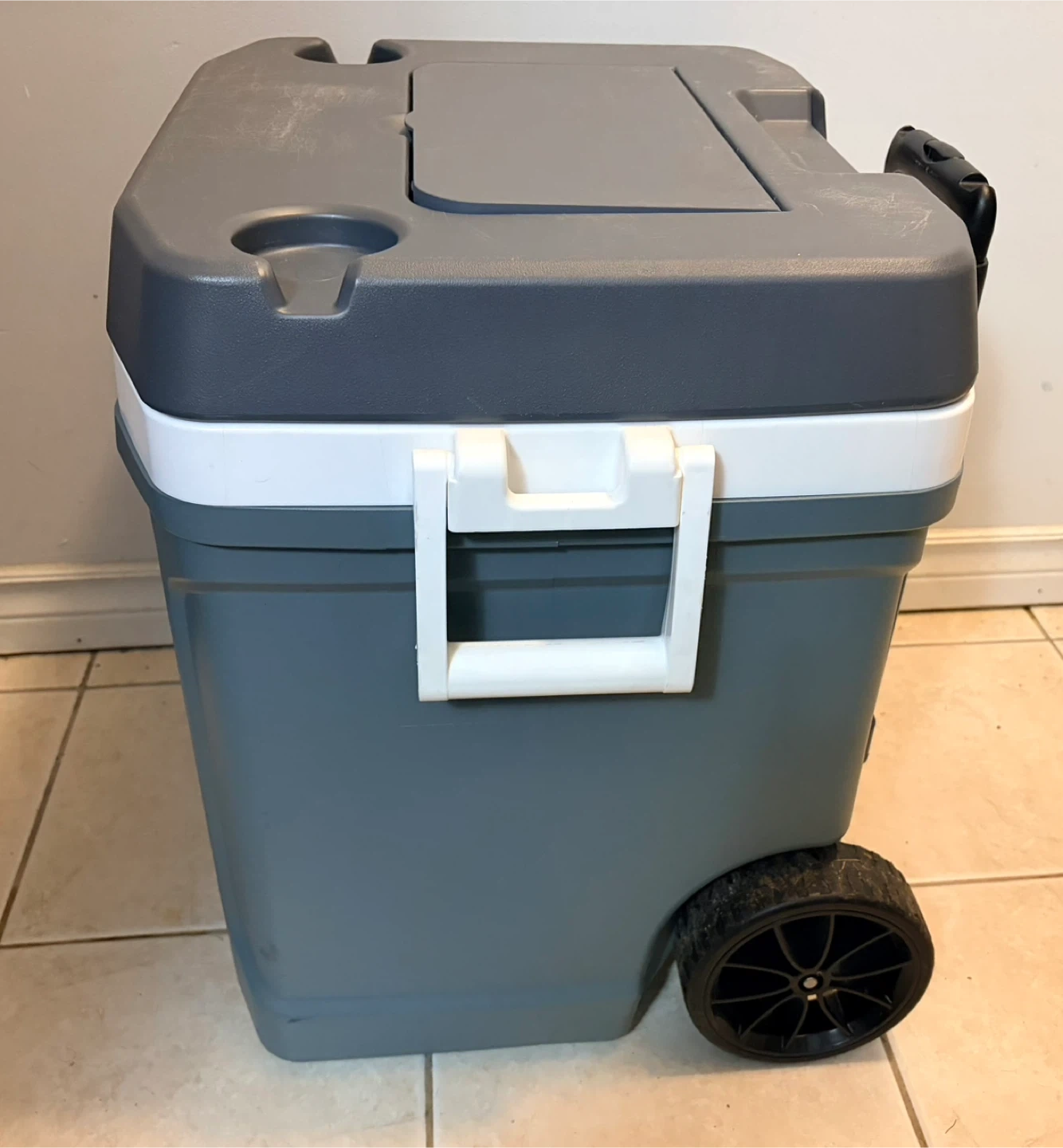 Selling an Igloo Latitude 62 Roller cooler. It has some signs of use. It features a telescoping handle and durable wheels for easy transport. Great for picnics, camping, or any outdoor event! It has a minor damage (i have added a picture), doesn’t affect functionality.