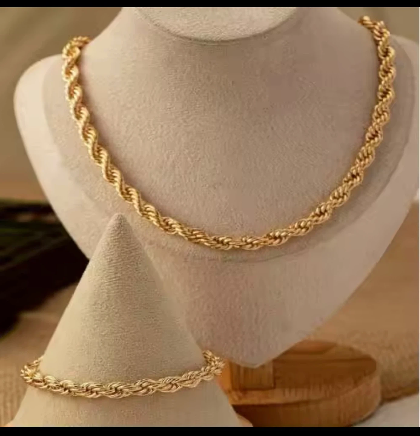 Stylish gold-tone rope chain necklace and bracelet set. Made from durable stainless steel. Necklace is 45cm long and 3mm wide. Bracelet is 18cm long and 3mm wide. Great for everyday wear! Lazurd jewelry is your go‑to statement piece for a luxury look.
