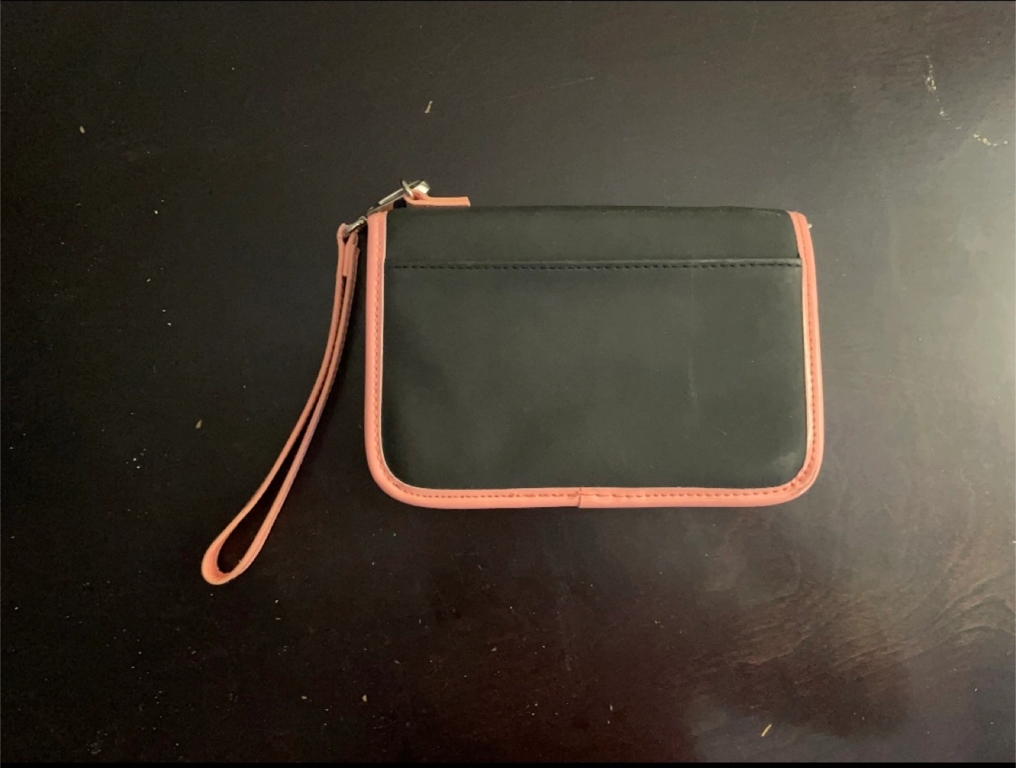 A two-toned wallet, with a black base. Features a pink, glossy cover with a cut-out design. Attached pink strap. Can hold your phone securely. A nice way to keep your phone safe and easily accessible.
