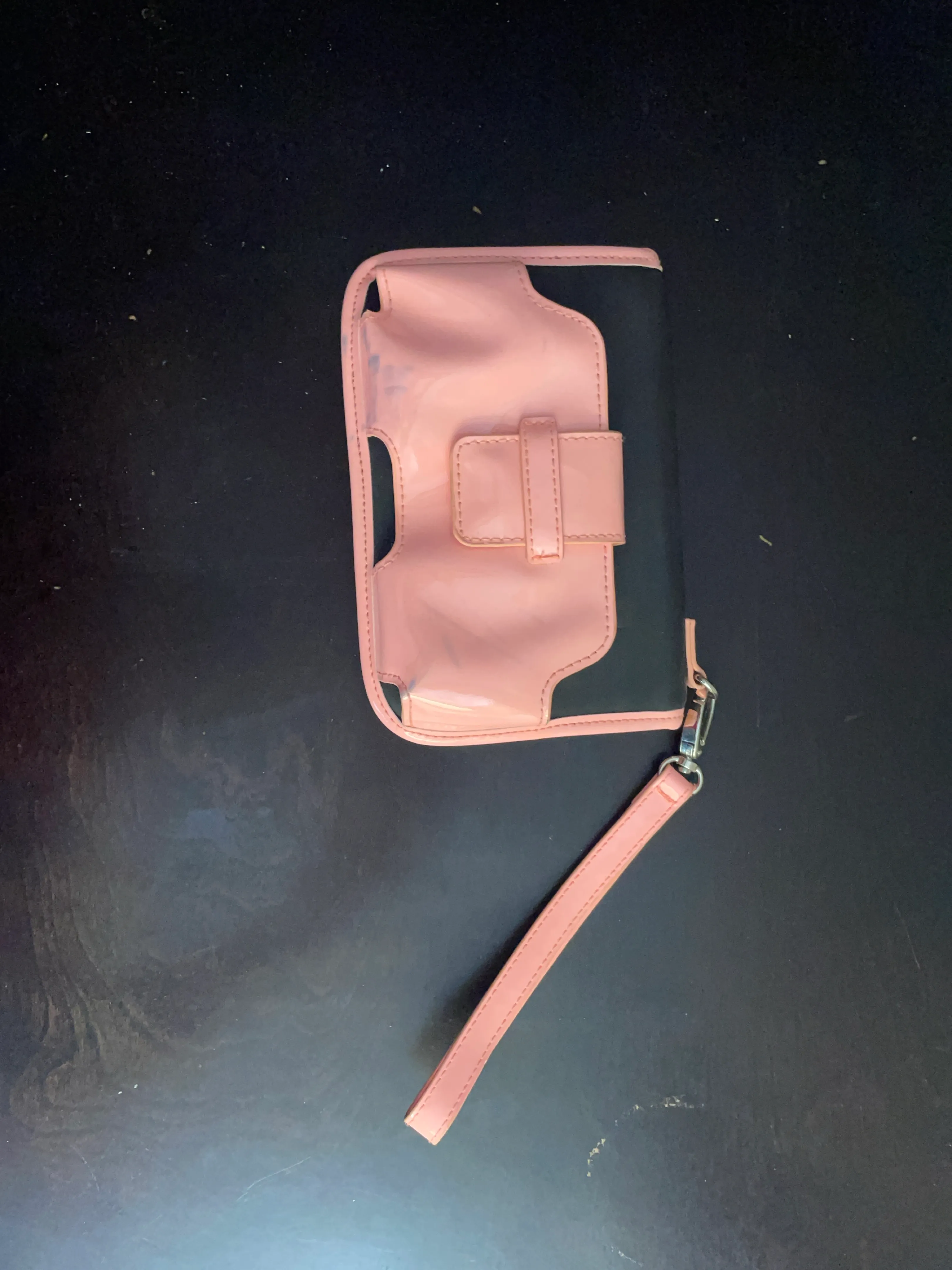 A two-toned wallet, with a black base. Features a pink, glossy cover with a cut-out design. Attached pink strap. Can hold your phone securely. A nice way to keep your phone safe and easily accessible.