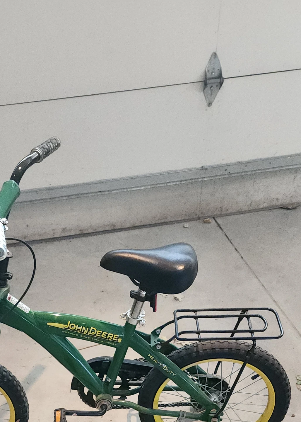 Selling a John Deere kids' bike. It's green and black with yellow accents on the wheels. This bike is in great shape and ready for a new rider!