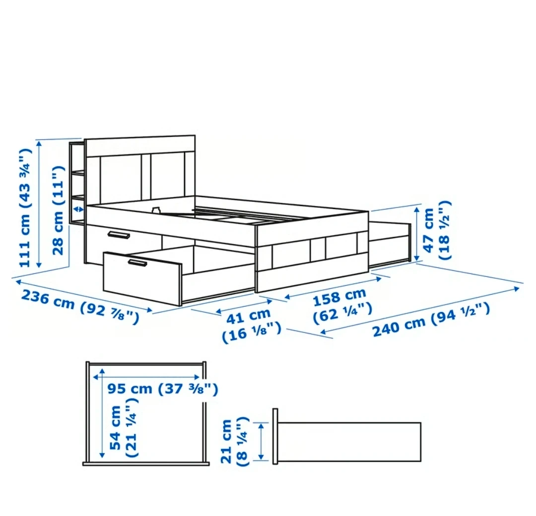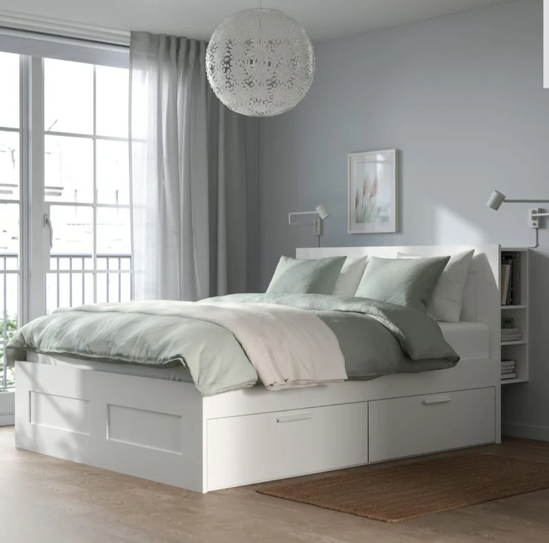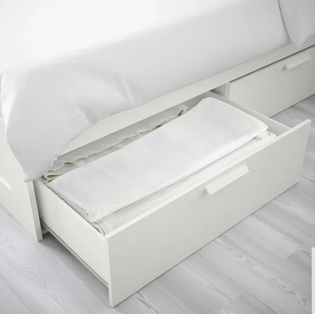 White MALM bed frame with four spacious storage drawers. Easy to assemble and adds plenty of storage to your bedroom. Bed measures 236 cm long by 158 cm wide. 10/10