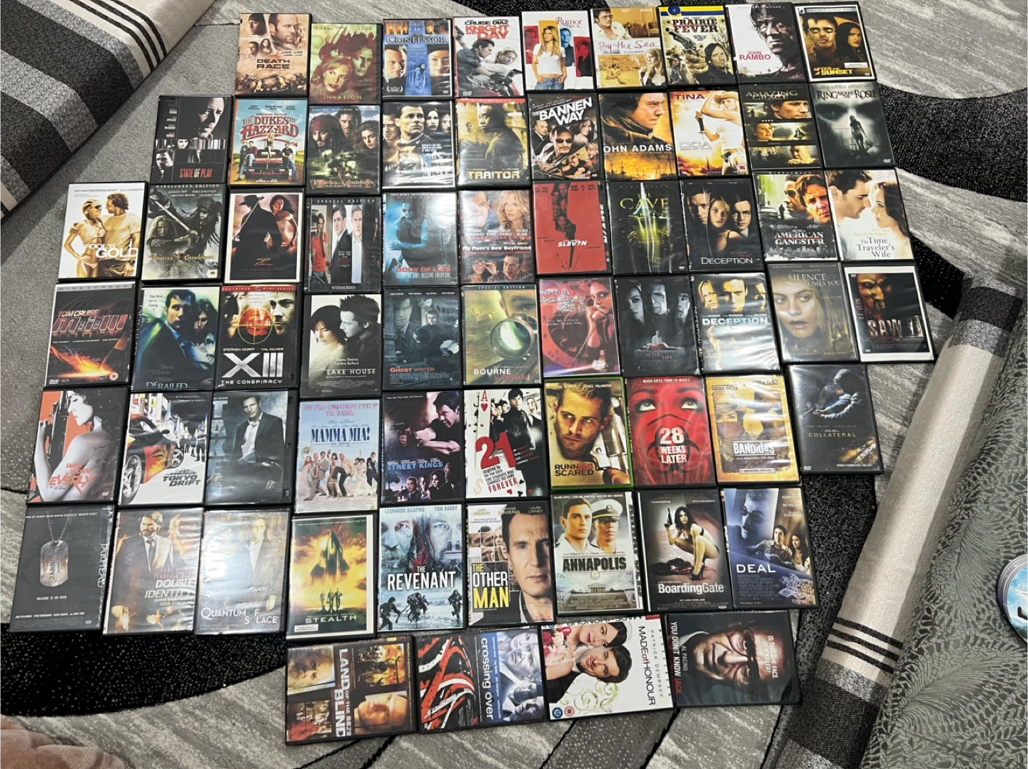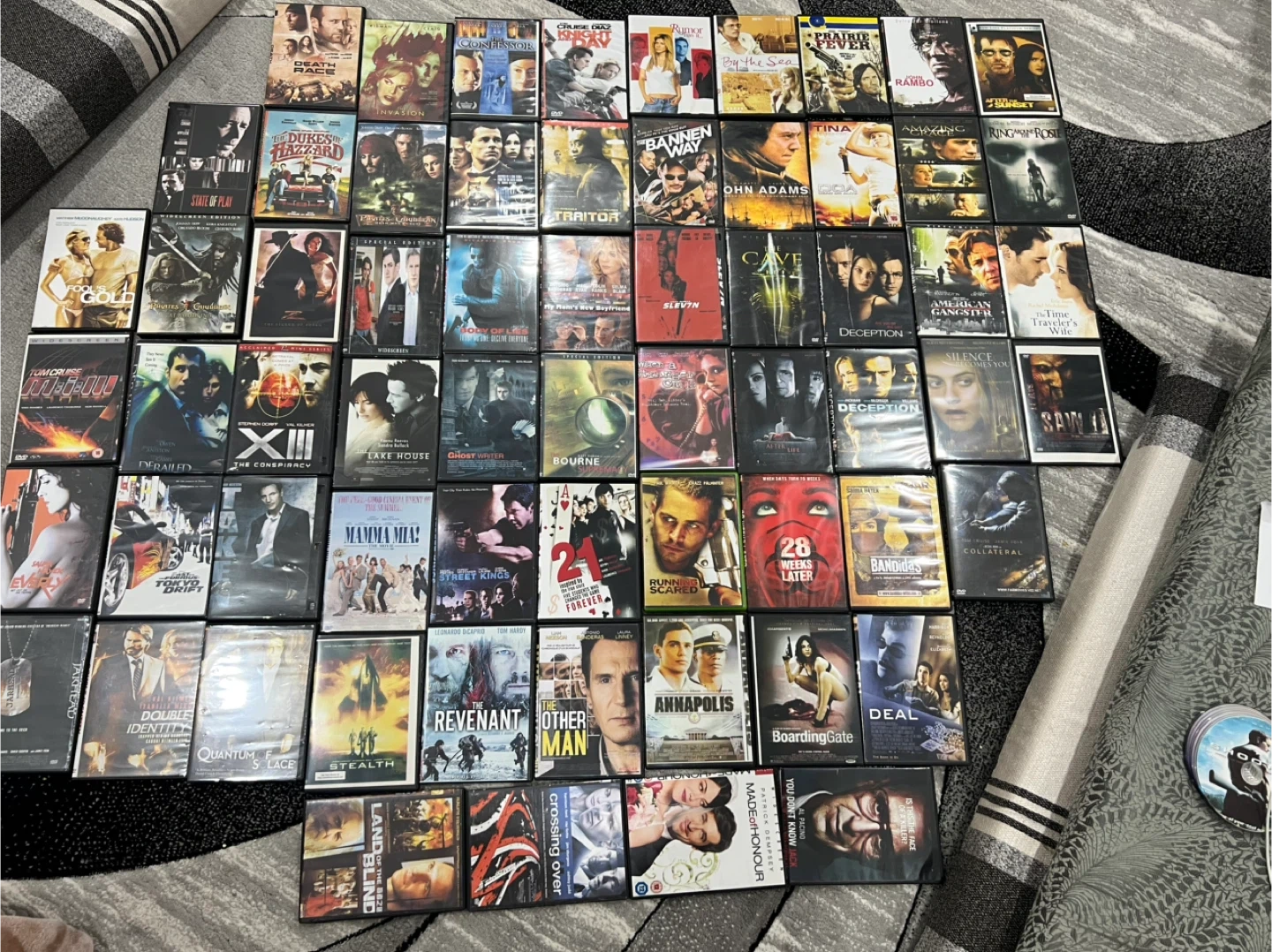 Selling a large DVD movie collection. Includes action, thriller, comedy, and drama titles like Mission Impossible, The Bourne Supremacy, American Gangster, The Revenant, Quantum of Solace, 28 Weeks Later and many more.