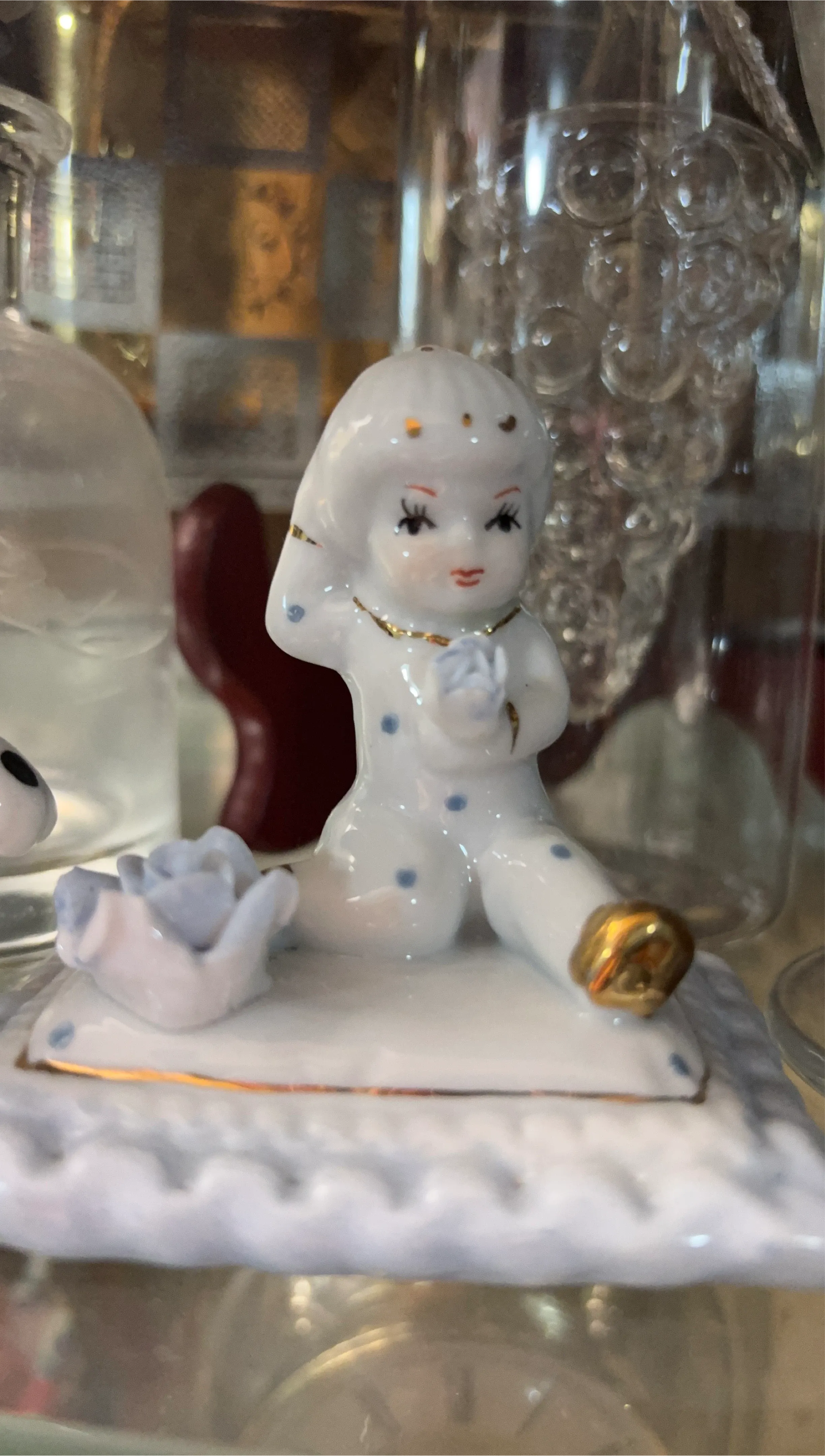 This is a charming ceramic figurine of a young girl holding a flower. It's white with blue polka dots and accents of gold. It's a lovely decorative piece!