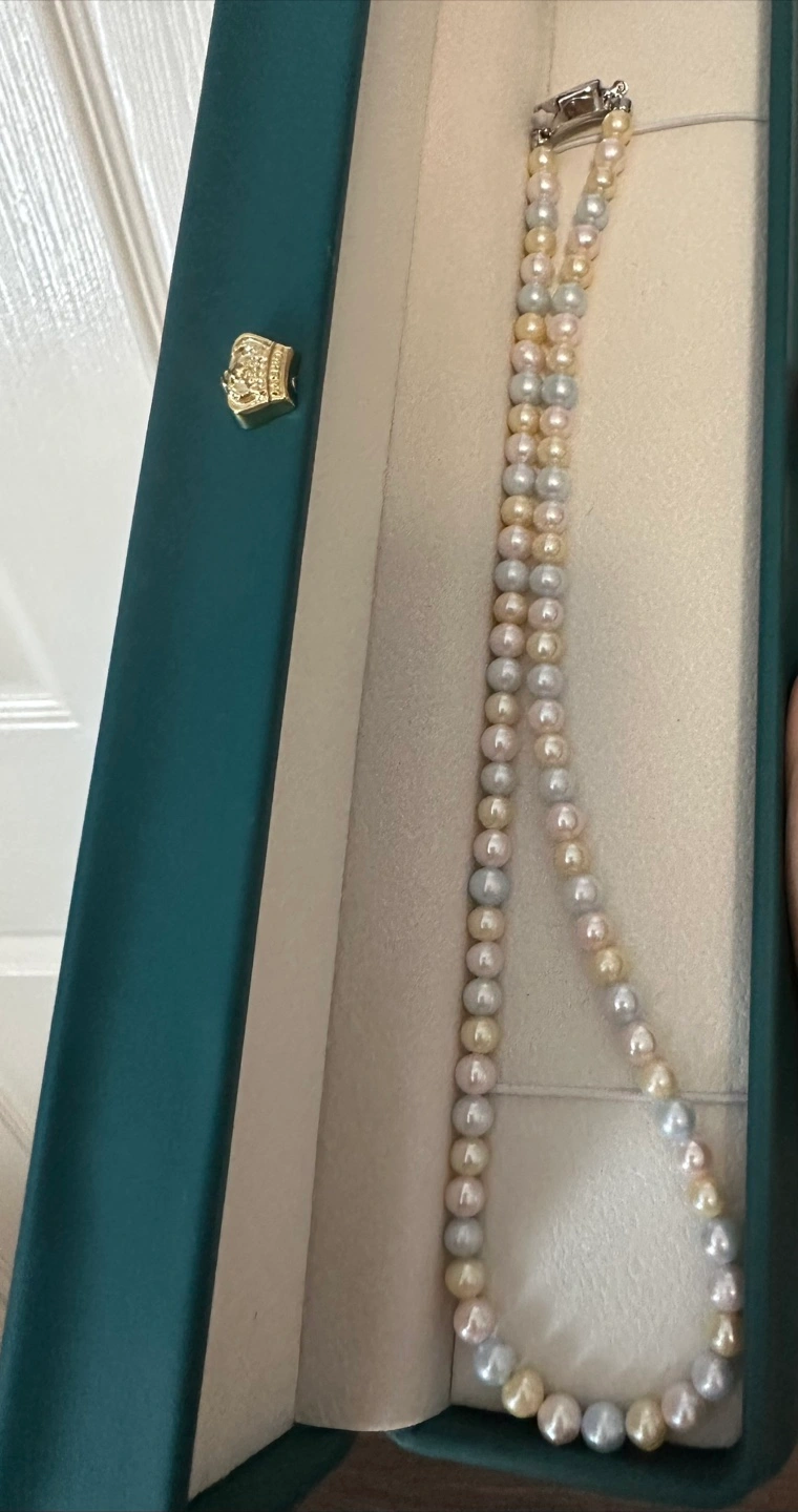 Beautiful pearl necklace in its original box! The pearls have a lovely sheen and the clasp is in perfect working order