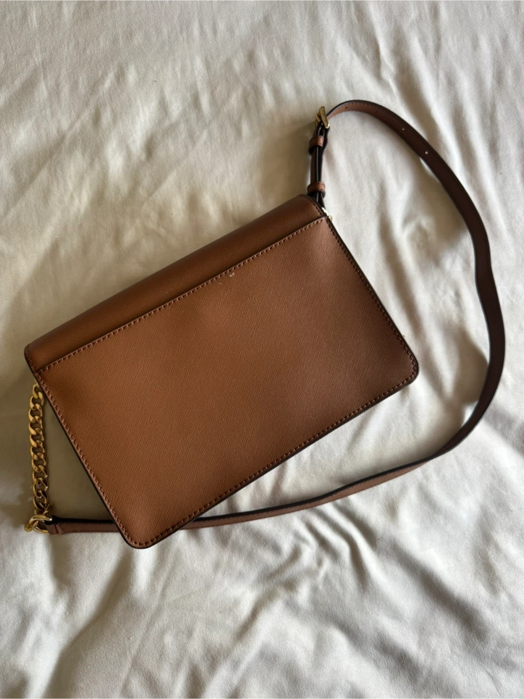 This Michael Kors wallet crossbody is made from brown saffiano leather. It's a versatile accessory for carrying your essentials.
