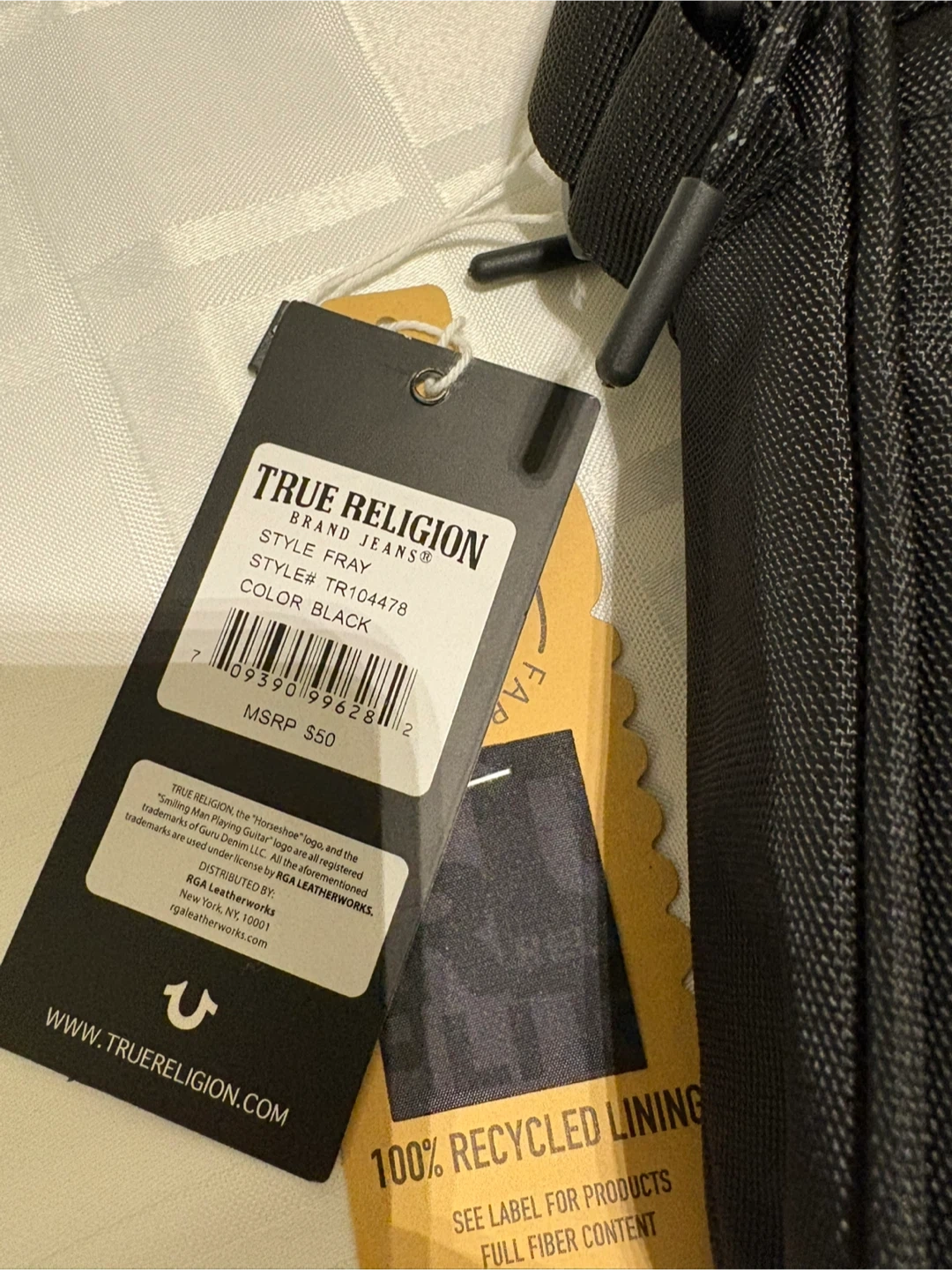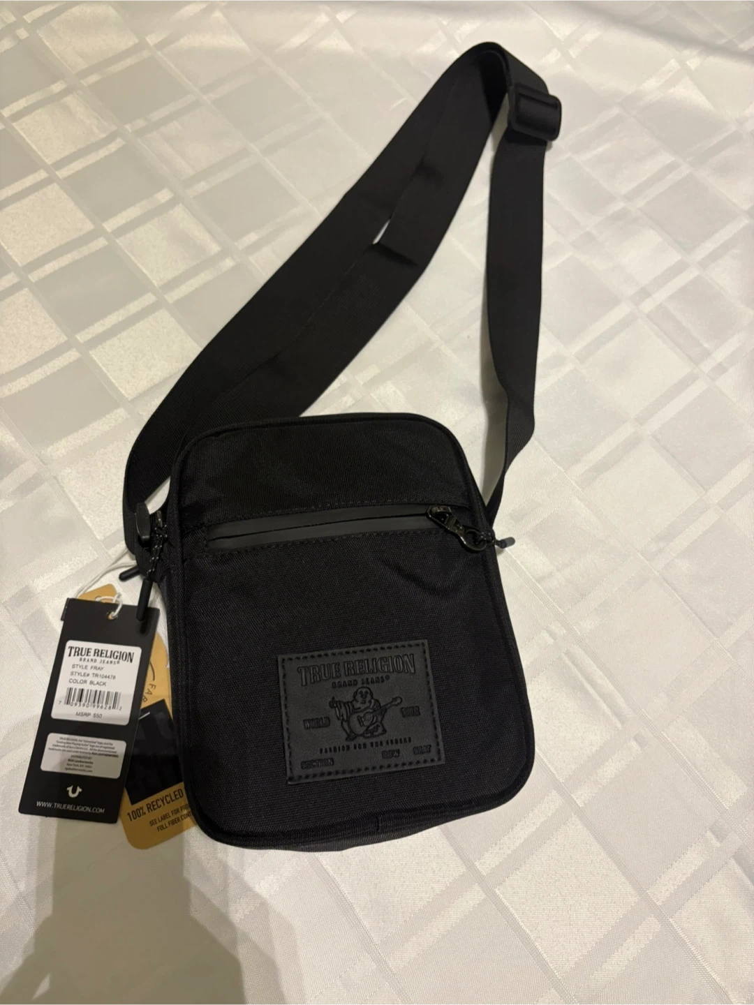 Here's a True Religion crossbody bag in black! It's the Fray style, and it's in great condition. The lining is 100% recycled, which is pretty cool. Originally retailed for $50.
