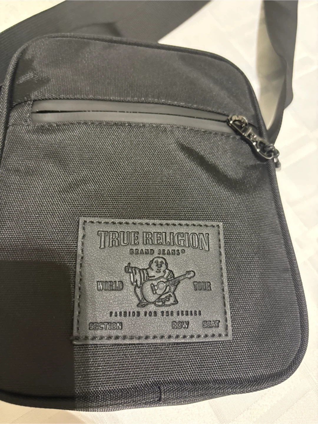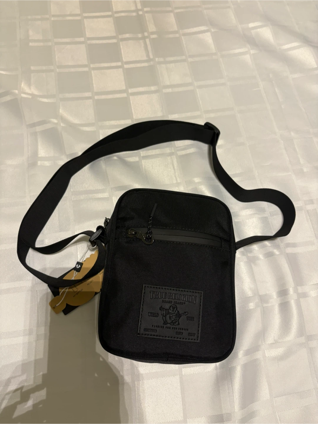 Here's a True Religion crossbody bag in black! It's the Fray style, and it's in great condition. The lining is 100% recycled, which is pretty cool. Originally retailed for $50.