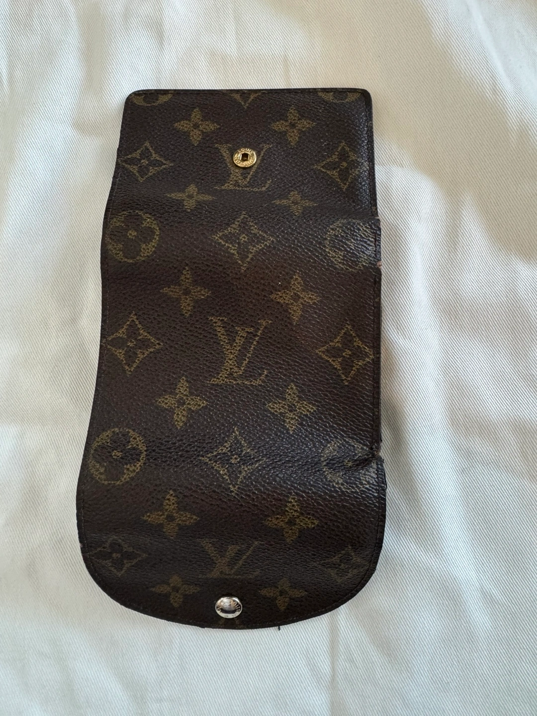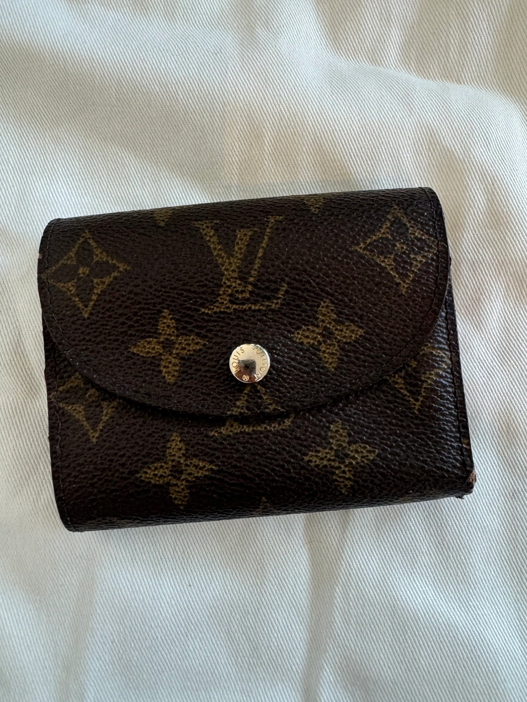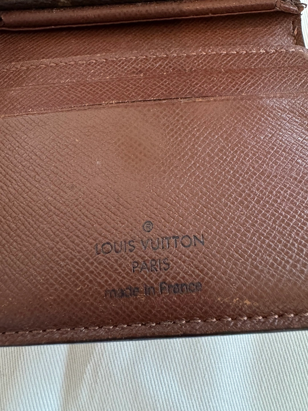 Authentic Pre-owned Louis Vuitton wallet. Monogram canvas exterior. Brown leather interior. Several card slots and a compartment for bills. Snap closure. Made in France.