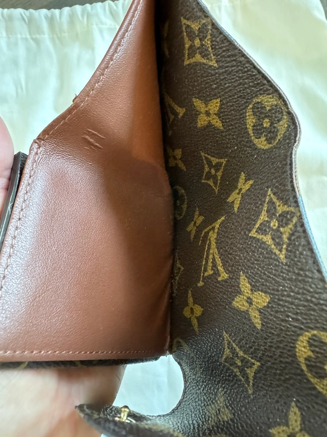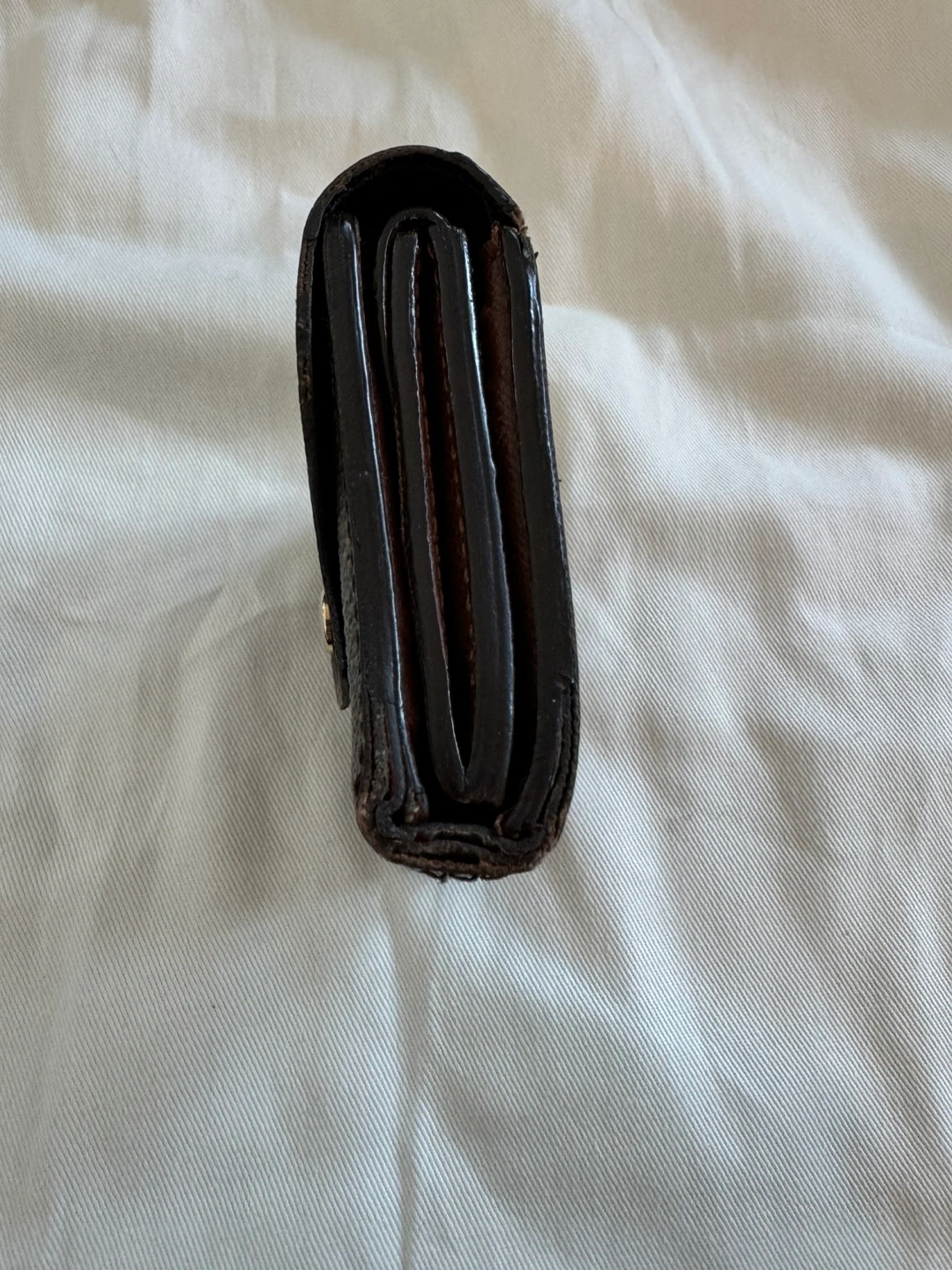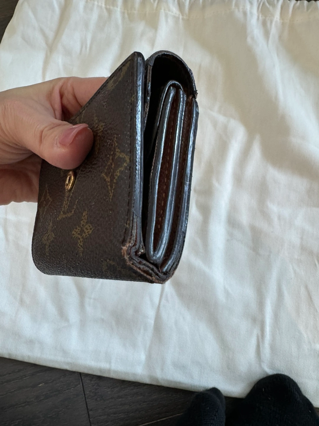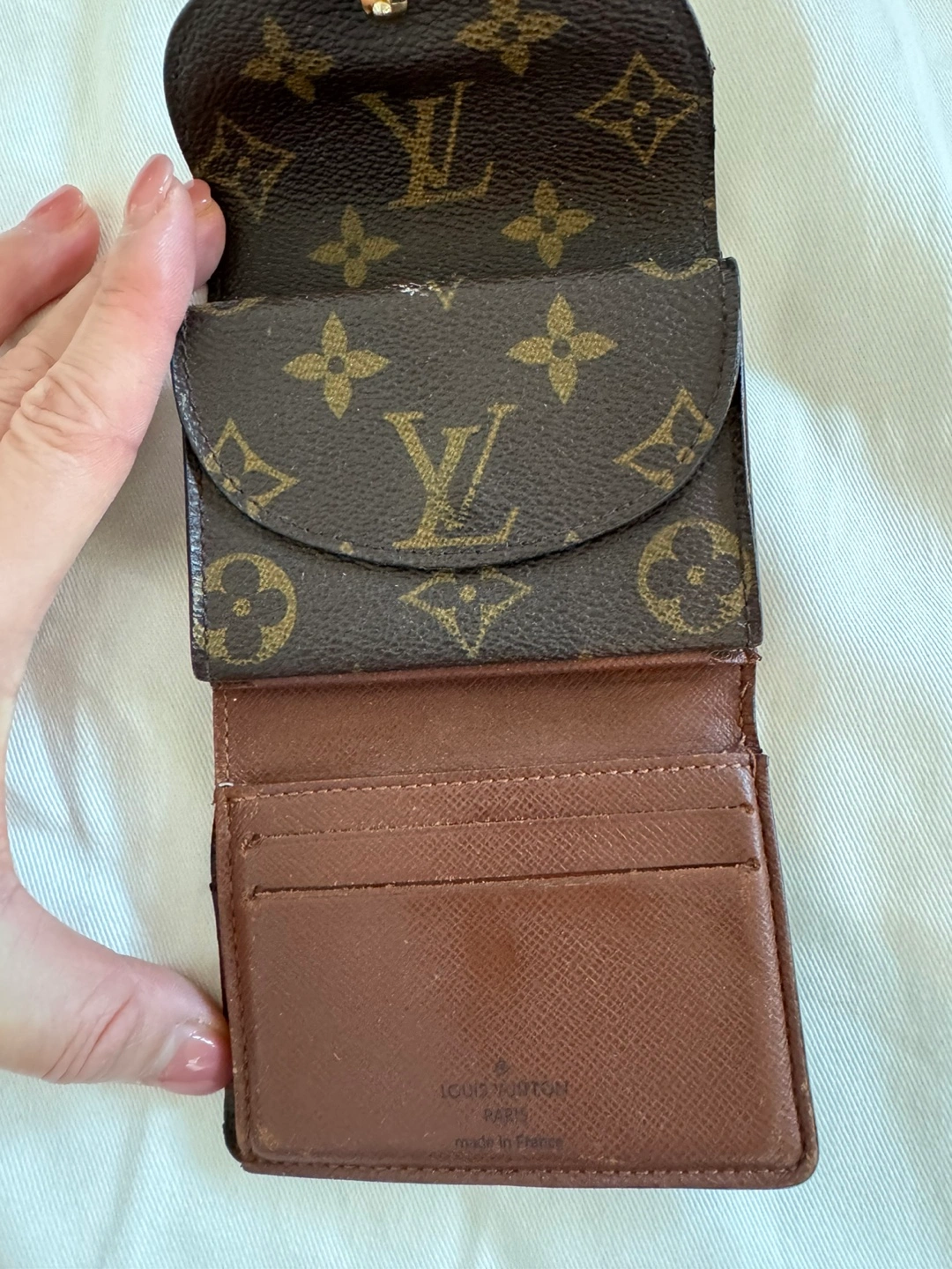 Authentic Pre-owned Louis Vuitton wallet. Monogram canvas exterior. Brown leather interior. Several card slots and a compartment for bills. Snap closure. Made in France.