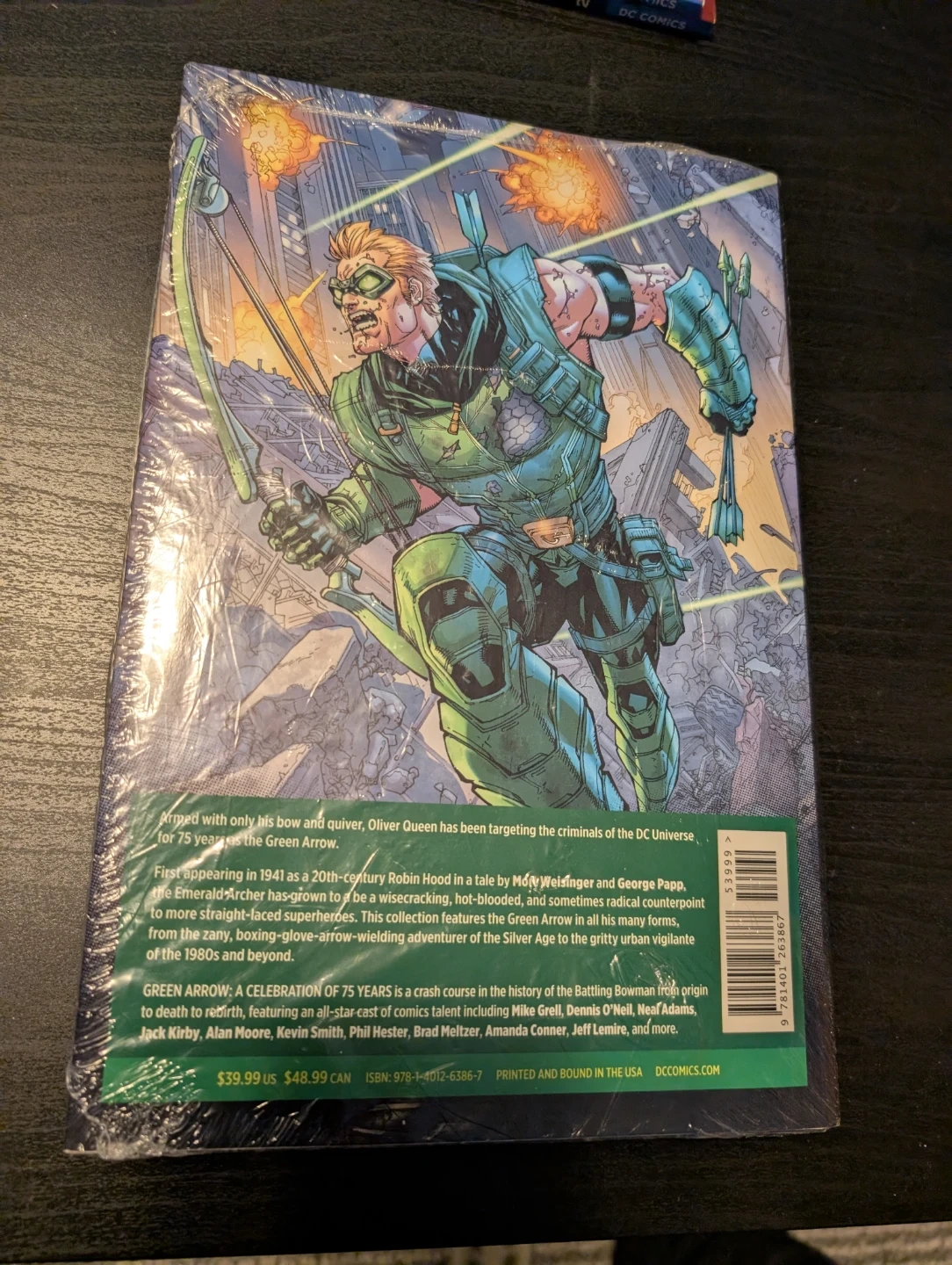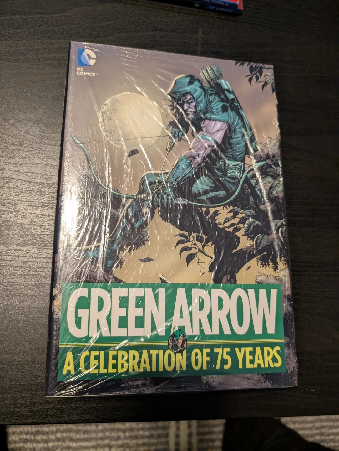 This DC Comics graphic novel celebrates 75 years of the Green Arrow. It includes a collection of Green Arrow stories from the 20th century and beyond. This edition is still in its original plastic wrapping.