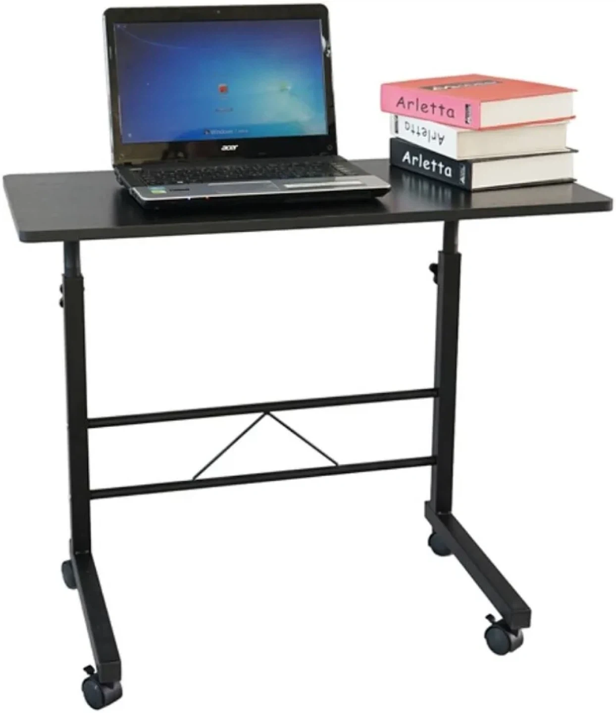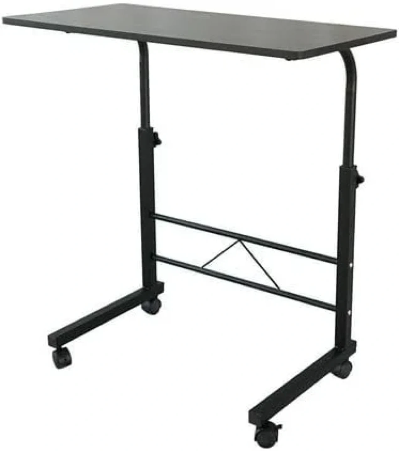 This is an adjustable rolling laptop table. It features a black tabletop and a metal frame with wheels. It's great for working or using a laptop anywhere. The legs are removable. Used but in good condition. Have sone minor scratches.
