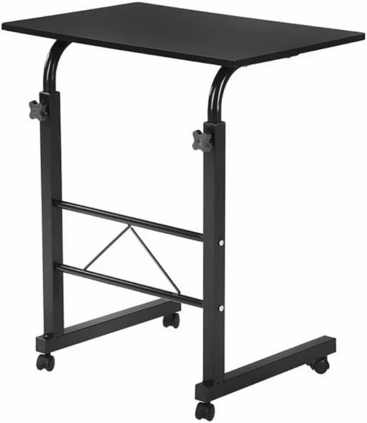 This is an adjustable rolling laptop table. It features a black tabletop and a metal frame with wheels. It's great for working or using a laptop anywhere. The legs are removable. Used but in good condition. Have sone minor scratches.