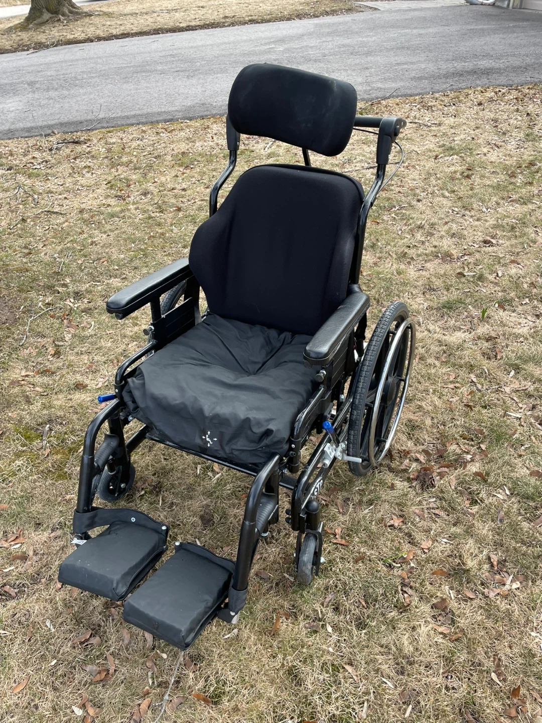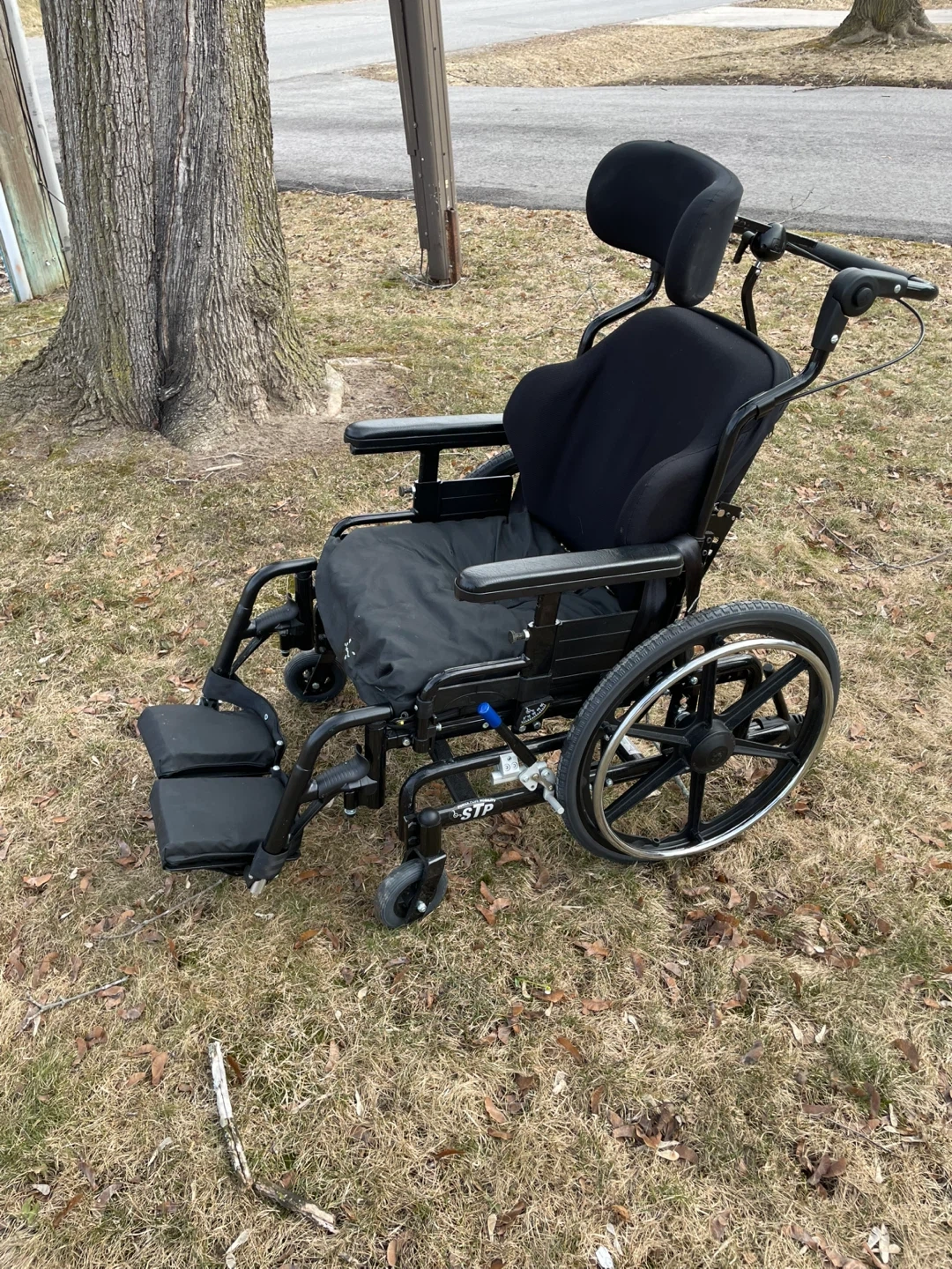 This is a black reclining wheelchair with a headrest and adjustable footrests. It's designed for comfort and support. Its sturdy frame and large rear wheels provide good maneuverability. 16 inch seat with Roho seat cushion included.