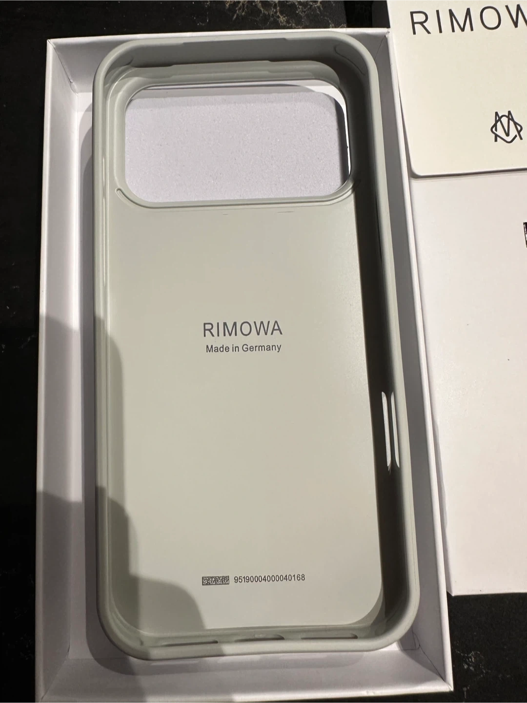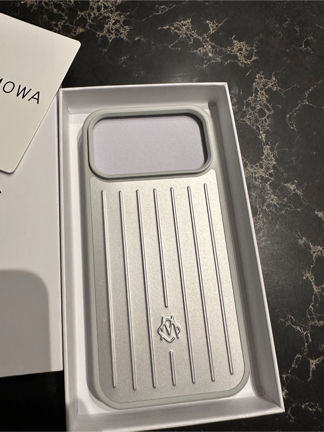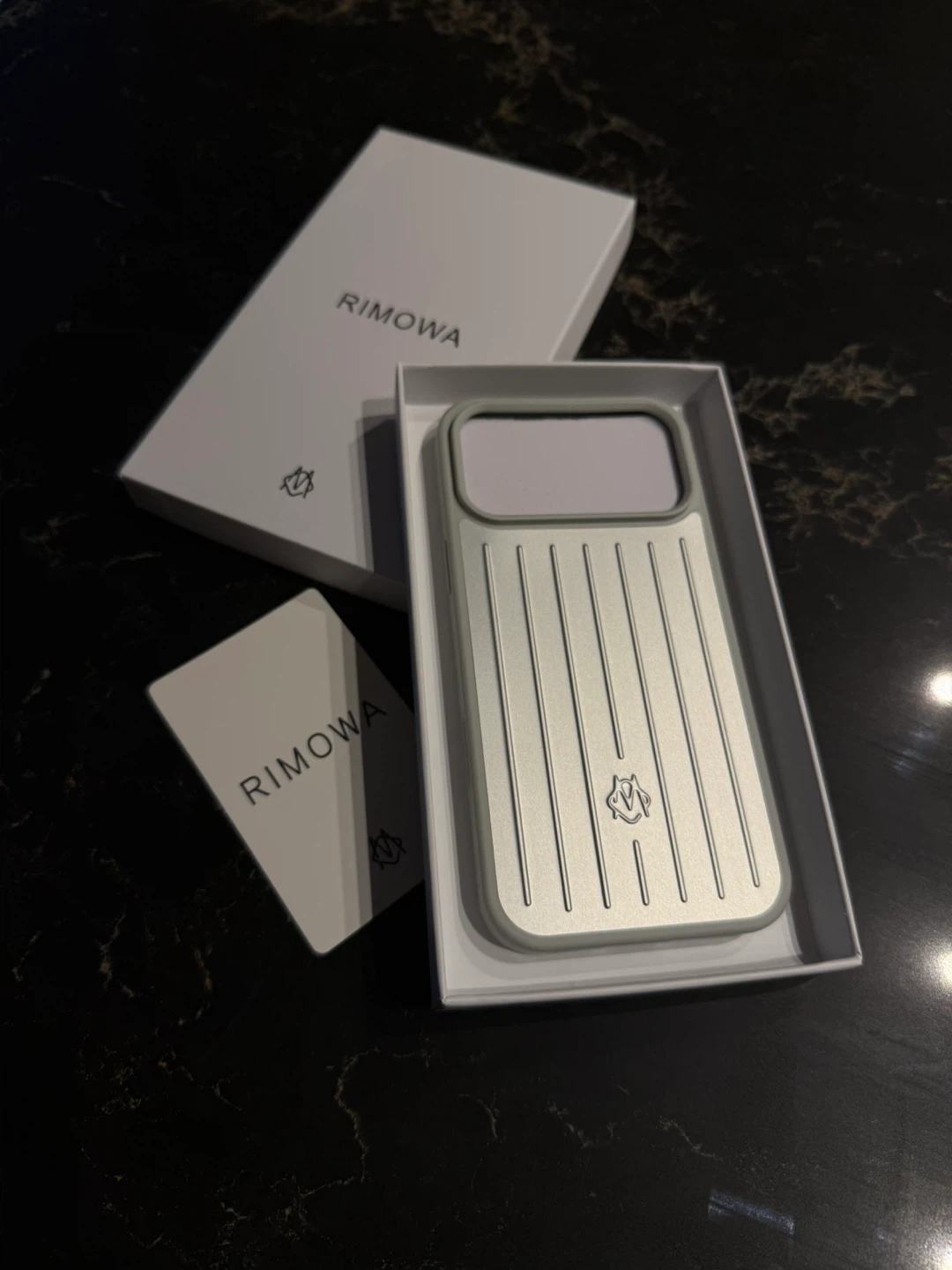 This is a RIMOWA iPhone case for 17 pro max. It's designed with a ribbed aluminium look and a protective interior. Includes original box and info card.
