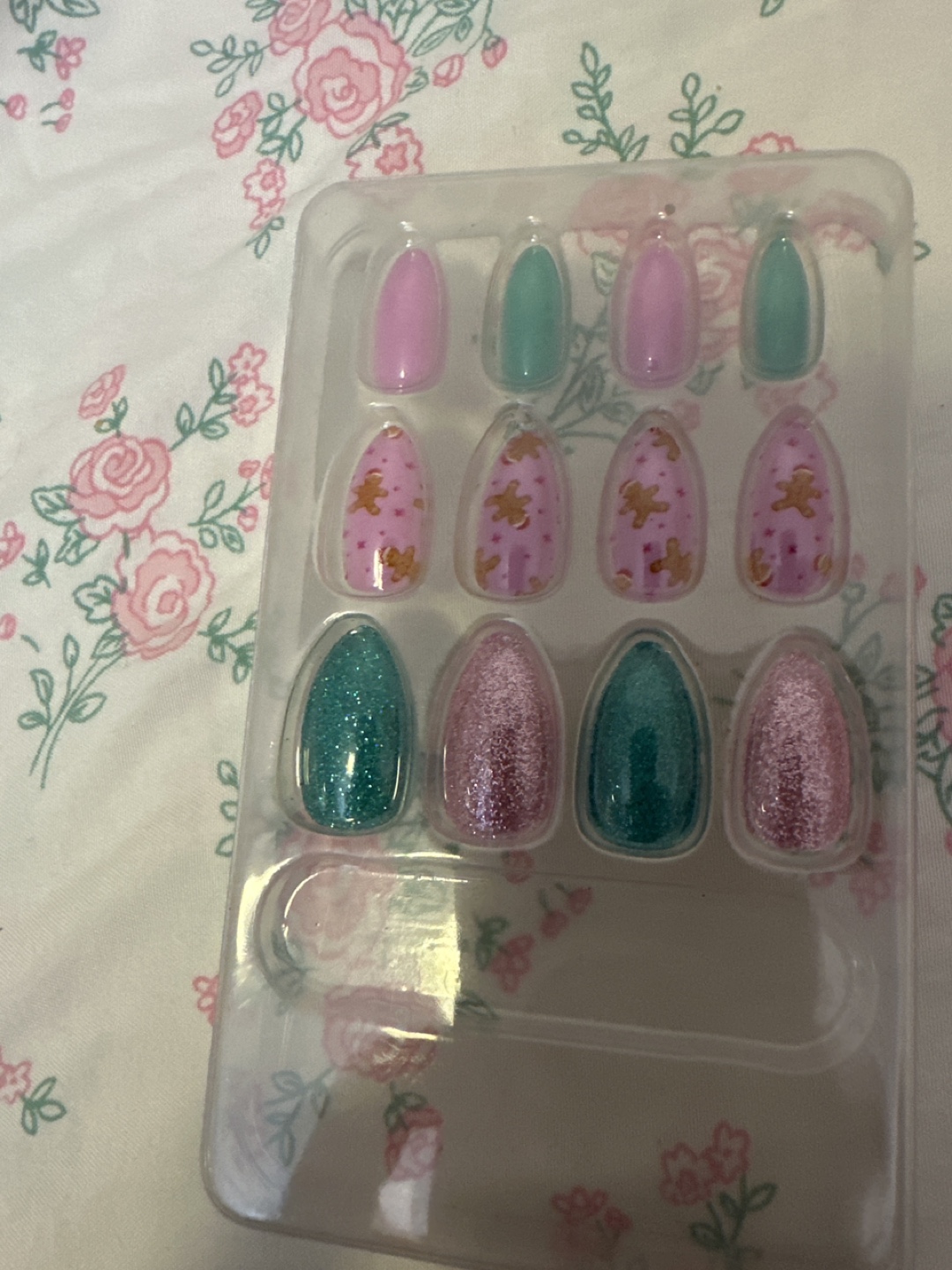 Cute set of nails in various colours and designs! Includes pink, green, and gingerbread-themed nails