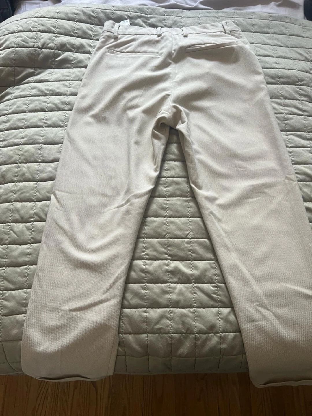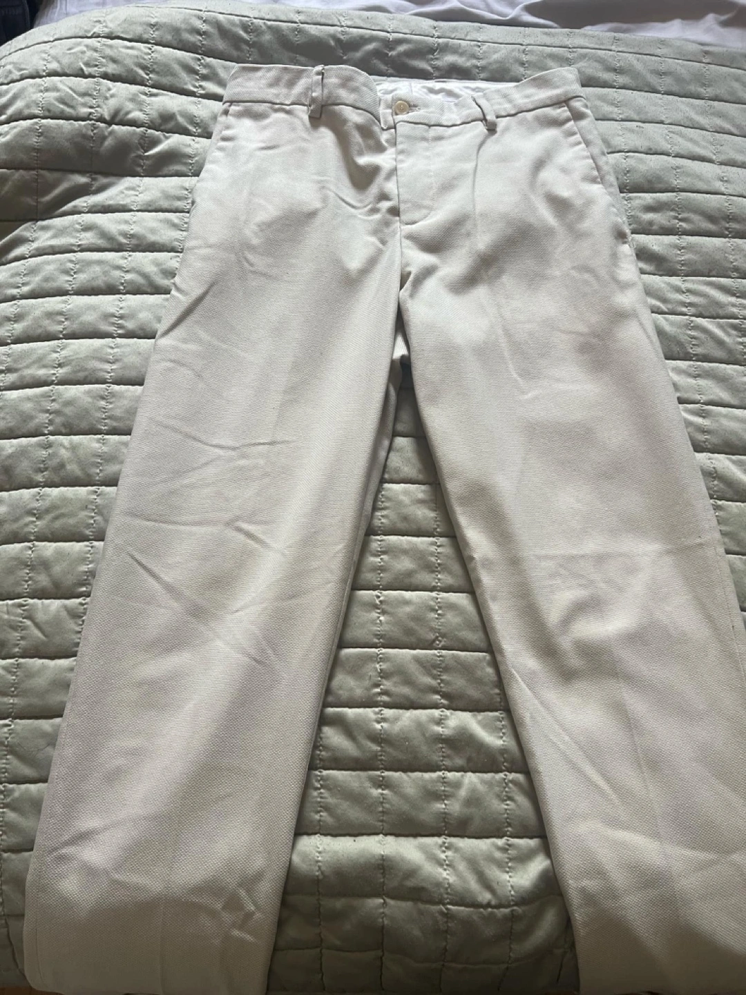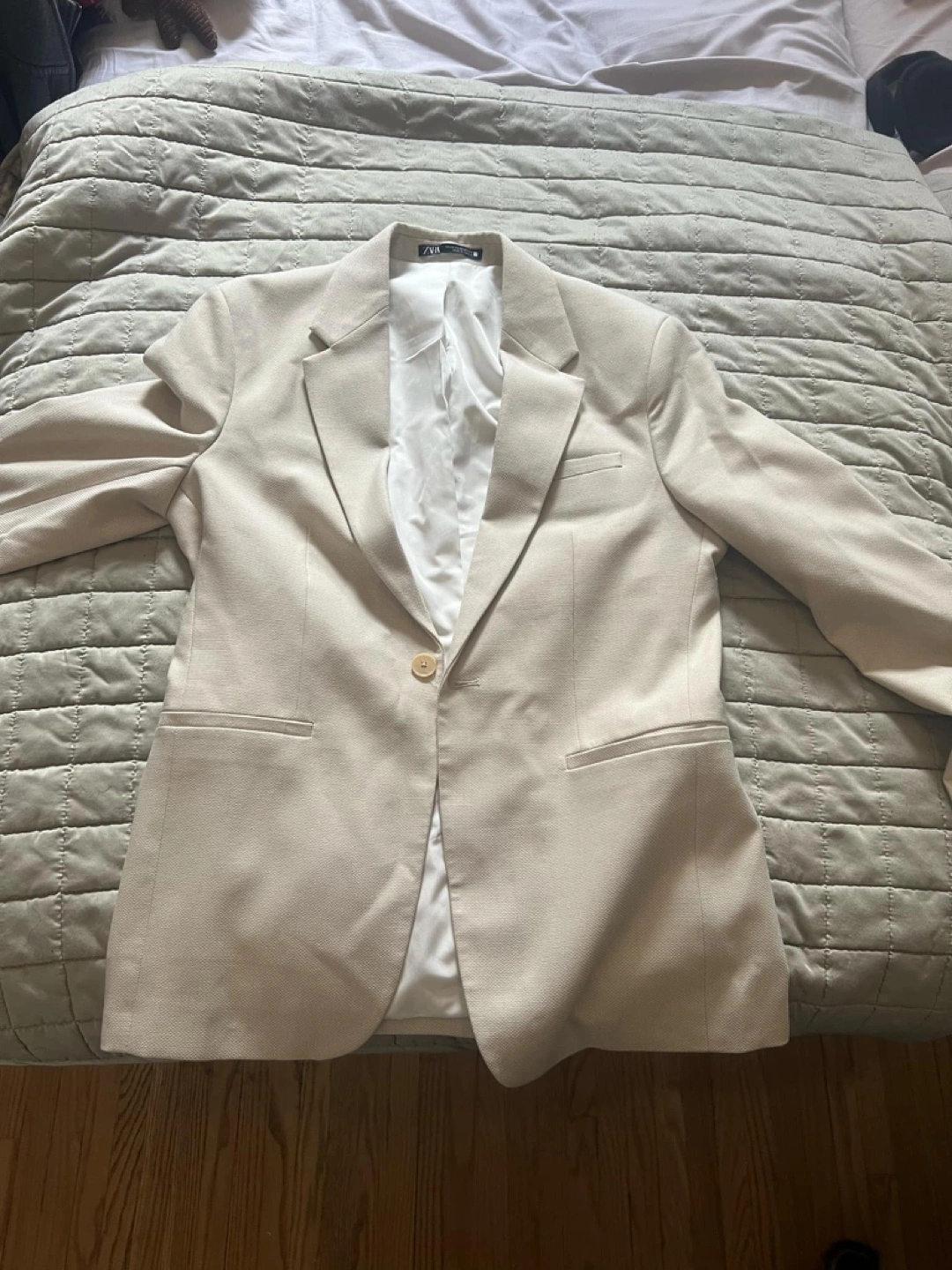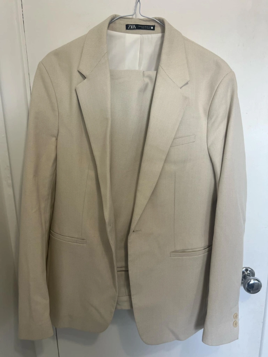 Cream coloured men's suit. Worn once. Slight creases. No stains. no holes or markings. Includes blazer and trousers. Great for prom, formals or weddings. Made in Morocco.