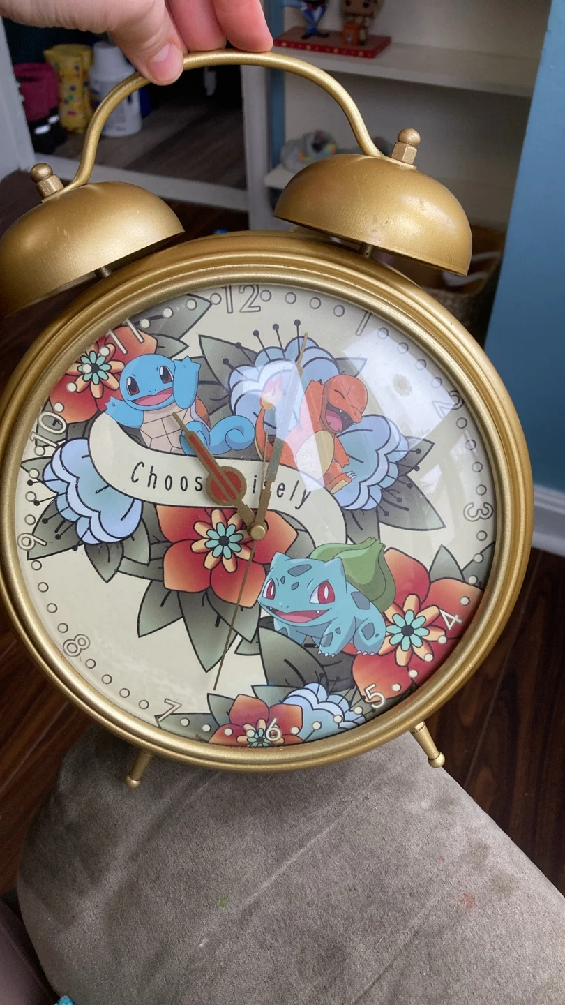 This classic twin-bell alarm clock features Pokémon characters Bulbasaur, Charmander, and Squirtle on its face. The clock has a gold-toned metal frame and a quartz movement. It's a fun way to wake up for any Pokémon fan!