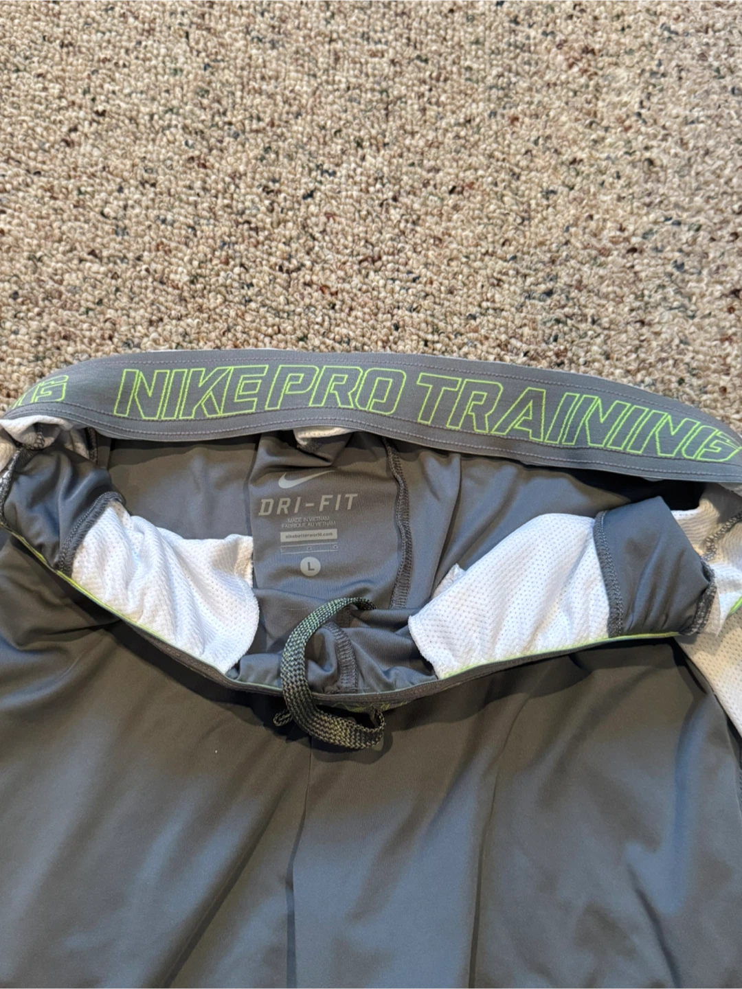 Selling a pair of Nike Pro Training Dri-FIT shorts in size L. They are gray with white accents and a neon green Nike swoosh. In good condition.