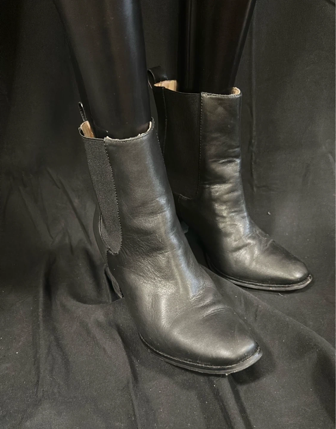 Classic black leather Chelsea boots. Features elastic side panels and a block heel. Leather upper and lining. Great for everyday wear!