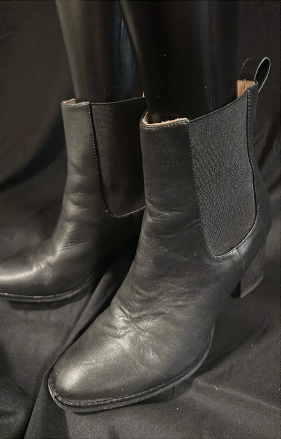 Classic black leather Chelsea boots. Features elastic side panels and a block heel. Leather upper and lining. Great for everyday wear!