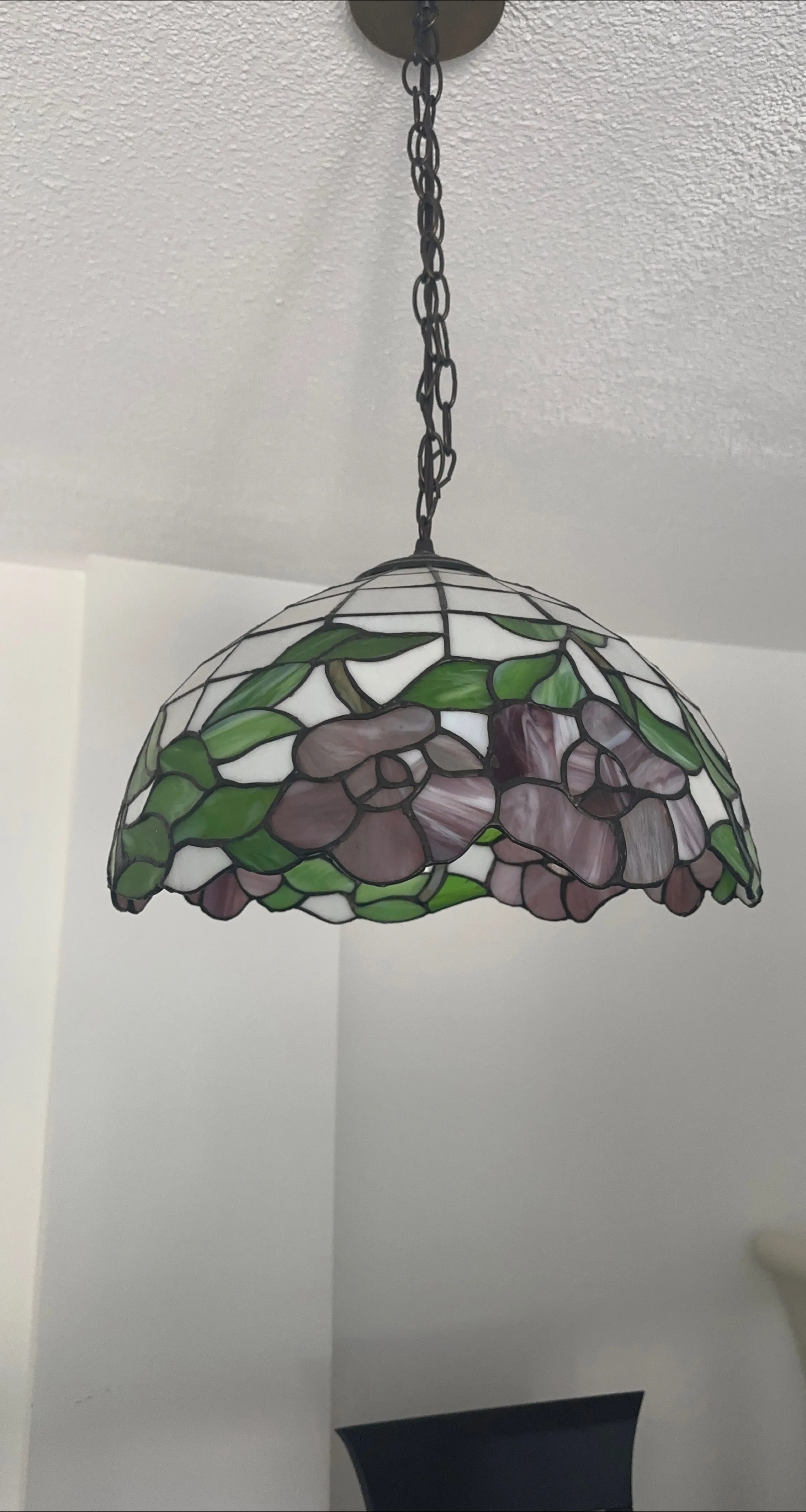 The shade appears to be in a floral pattern. It hangs from a chain. The colour of the shade is predominantly green and purple. Adding this lamp to a room is sure to add a peaceful ambiance.