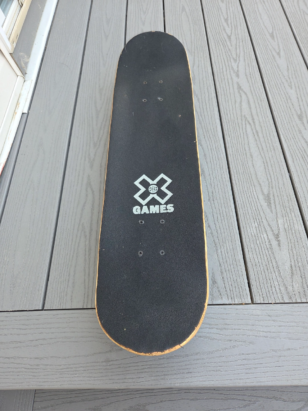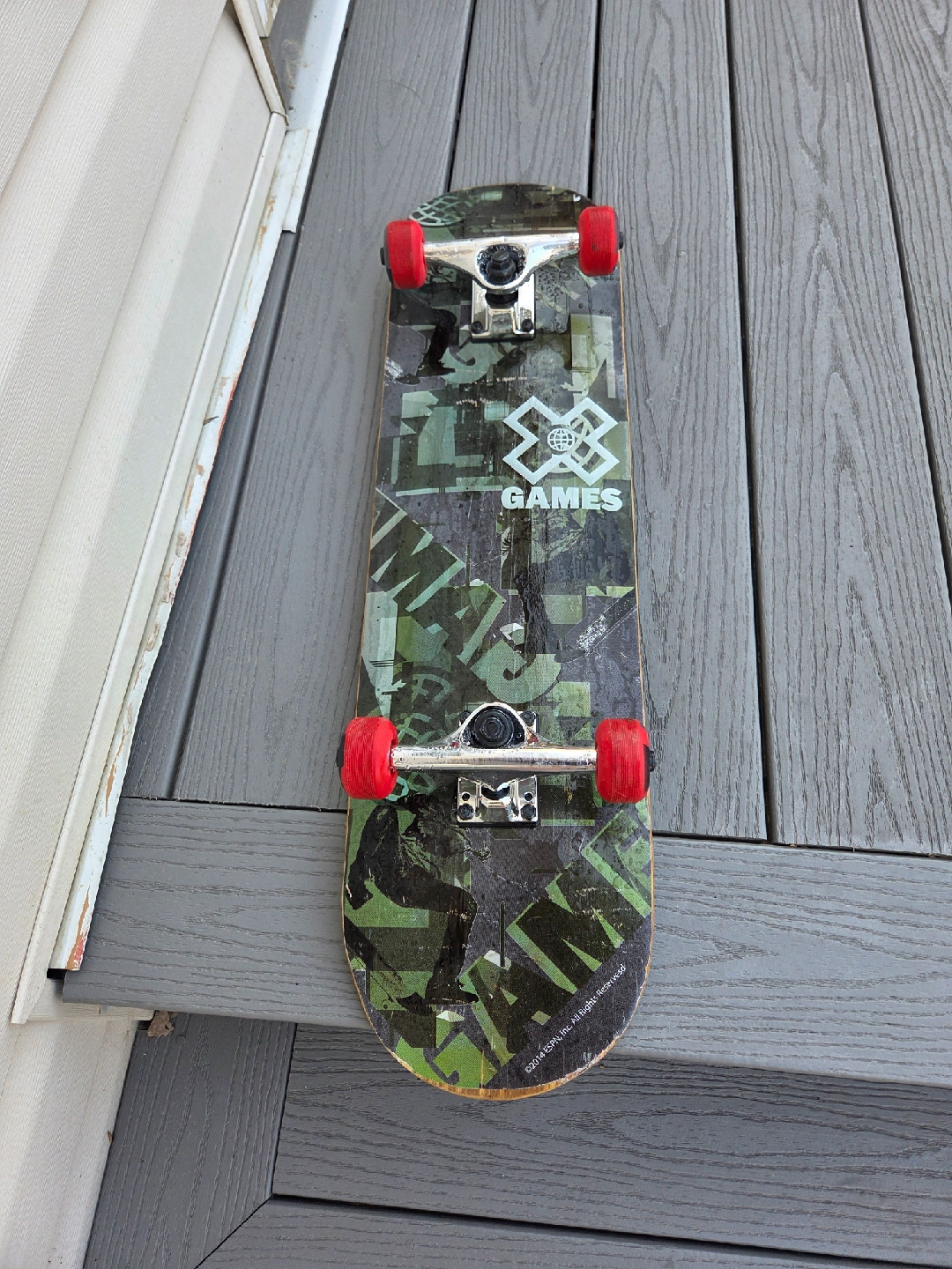 20Selling an X Games skateboard. It has a cool camouflage design on the bottom and the X Games logo on both sides. The wheels are red. Ready for some fun at the skate park!
